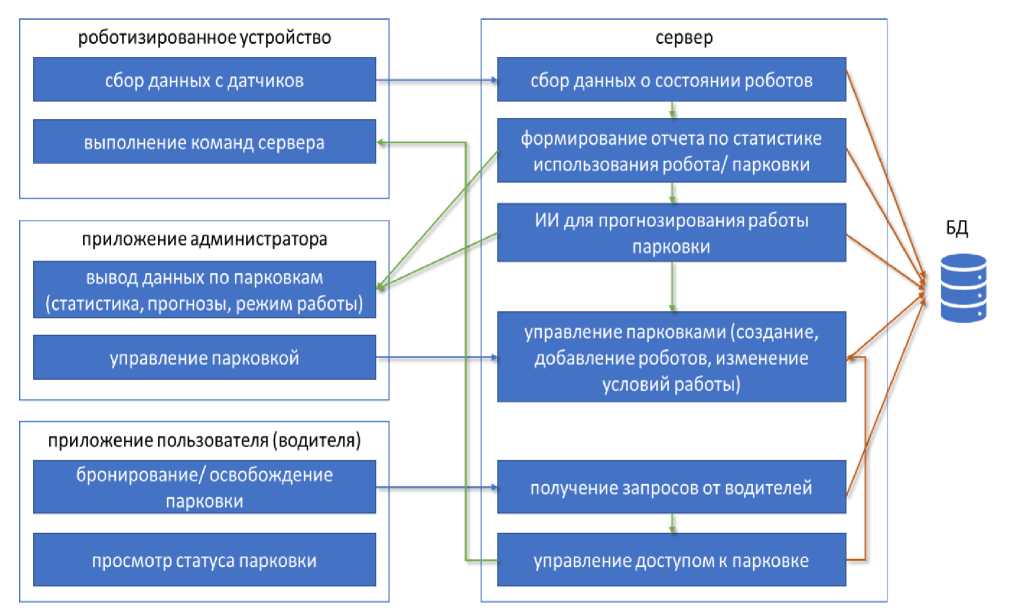 Программная часть сервиса реализована в виде клиент-серверного приложения. В качестве клиентов на ней выступают программа микроконтроллера роботизированного устройства, приложение для администратора парковки и приложение для водителя. Роботизированное устройство отвечает за сбор и отправку данных на сервер, а также выполнение его команд (за исключением особых случаев, например, при наличии автомобиля над роботом-парковщиком – он не может подняться). Приложение администратора позволяет управлять парковкой, в частности, добавлять и удалять парковки, роботов-парковщиков и пользователей, а также устанавливать режим работы парковки. Кроме того, приложение позволяет контролировать сбор оплаты и метод расчета цены парковочного места (в том числе и автоматически, с учетом текущей и прогнозируемой загрузки парковки). Также администратор может отслеживать статистику и прогноз по состоянию и загрузке парковки. Приложение водителя должно обеспечить основной функционал – просмотр наличия свободных мест, бронирование, управление роботизированным устройством и оплату услуг парковки. Сервер отвечает за сбор, анализ и управление всеми парковками, а также хранение собранной информации в базе данных. Архитектура программной реализации сервиса приведена на рис. 4.