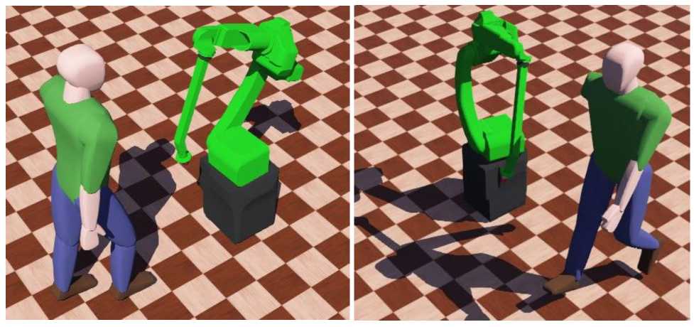 В процессе движения оператора минимальное расстояние между ним и роботом постепенно сокращалось, и при достижении заданного безопасного порога робот начинал реагировать, удаляясь от оператора, чтобы избежать возможного столкновения. Моментальные снимки проведения 1-го и 2-го тестов представлены на рис. 2.