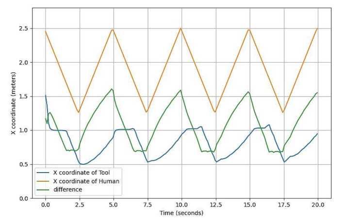 Fig. 3. Change in coordinates of a person, a robot tool and their difference during the 1st test
