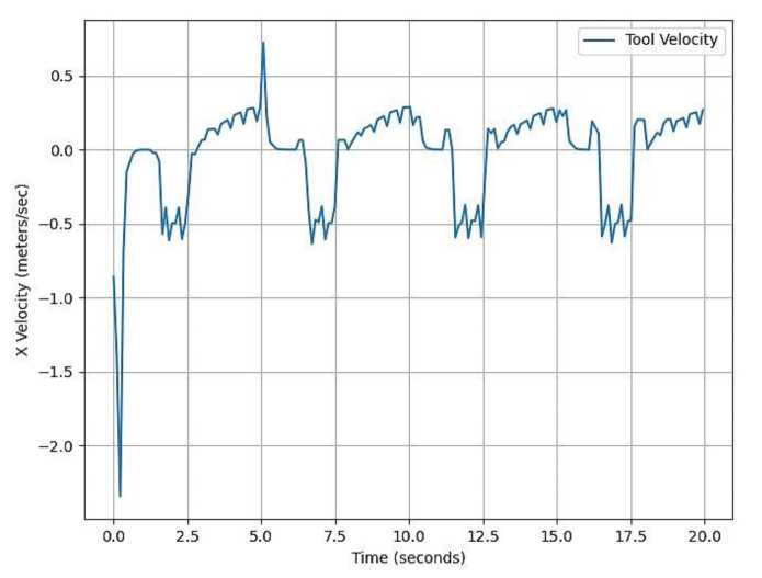Так как Webots является физическим симулятором, в нем нет инструментов для точного определения скорости объекта, ввиду чего скорость инструмента находится путем численного дифференцирования координаты. По этой причине график скорости имеет колебательный характер в случае 1-го (рис. 5) и 2-го (рис. 6) тестов.
