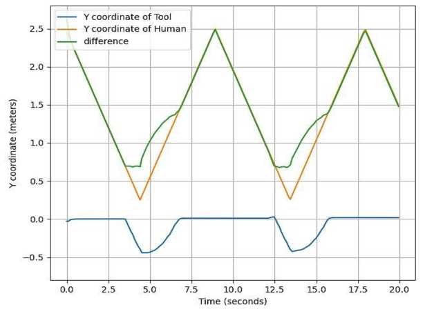 Fig. 5. Change in the Y coordinate of the human, the robot tool and their difference during the 2nd test