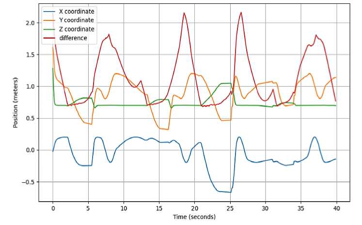 На основании полученных данных были построены графики, которые позволили провести анализ работы системы. На рис. 3 отображены координаты оси конечного эффектора и оператора, а также разница между ними. В начальный момент времени робот оставался неподвижным, в то время как оператор двигался с постоянной скоростью порядка 1,15 м/с вдоль оси , направляясь к роботу. Как только расстояние между роботом и оператором сократилось до заданного безопасного значения, робот начал удаляться, реагируя на приближение человека.
