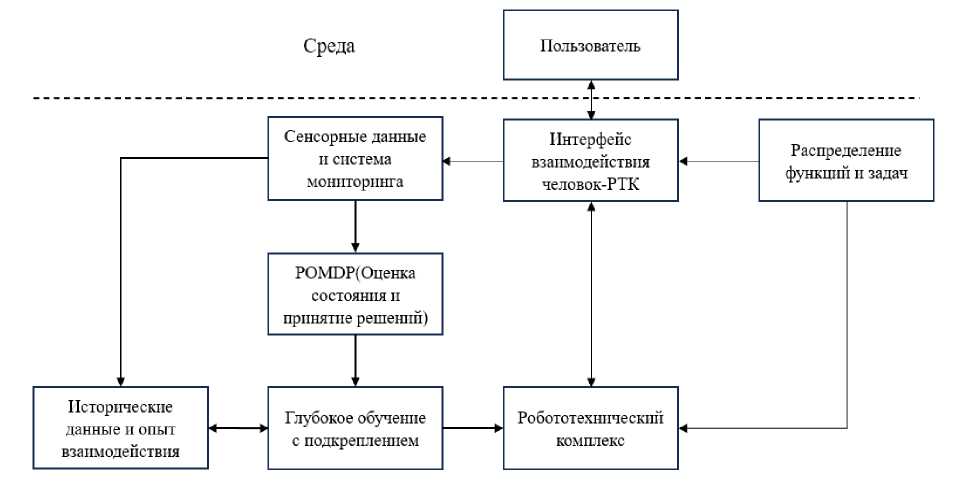 Пользователь взаимодействует с системой через интерфейс взаимодействия человек-робот. Этот интерфейс позволяет пользователю задавать задачи и получать обратную связь от системы. Интерфейс взаимодействия человек-робот обрабатывает команды от пользователя и передает их в систему мониторинга и сенсорных данных. Сенсорные данные и система мониторинга собирают данные из окружающей среды, включая информацию о состоянии роботов и внешних условиях. Эти данные поступают в POMDP для дальнейшего анализа. POMDP анализирует сенсорные данные и оценивает вероятности различных состояний окружающей среды. На основе этой оценки POMDP формирует возможные стратегии действий. Алгоритм DRL используется для адаптации поведения РТК на основе опыта и исторических данных. Этот модуль обучает РТК оптимальным действиям через пробу и ошибку, улучшая их способность адаптироваться к изменениям в окружающей среде. РТК получает команды и стратегии от системы принятия решений и выполняет задачи в реальной среде, взаимодействуя с пользователем через интерфейс.