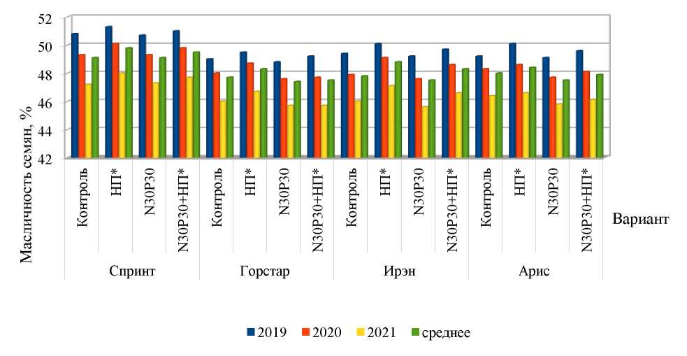 Анализ результатов исследования показал, что на фоне глубокого рыхления максимальная масличность семян по всем гибридам зафиксирована также в 2019 году – наиболее засушливом по условиям увлажнения почвы. В целом получена высокая масличность по всем исследуемым гибридам, хотя и ниже, чем по отвальной вспашке: Спринт – 47,2 %, Горстар – 45,3 %, Ирэн – 46,1 % и Арис – 46,3 %. В среднем за 2019–2021 гг. масличность семян исследуемых гибридов по обработке почвы была 44,4 % (НСР05 – 0,1 %). В среднем по гибридам она составила: по Спринту – 45,3 %, Горстар – 43,7 %, Ирэн – 44,4 % и Арису – 44,2 % (НСР05 – 0,1 %). По доле влияния удобрений в среднем масличность семян исследуемых гибридов выявлена на уровне 46,2; 46,8; 45,9 и 46,4 % (НСР05 – 0,1 %).