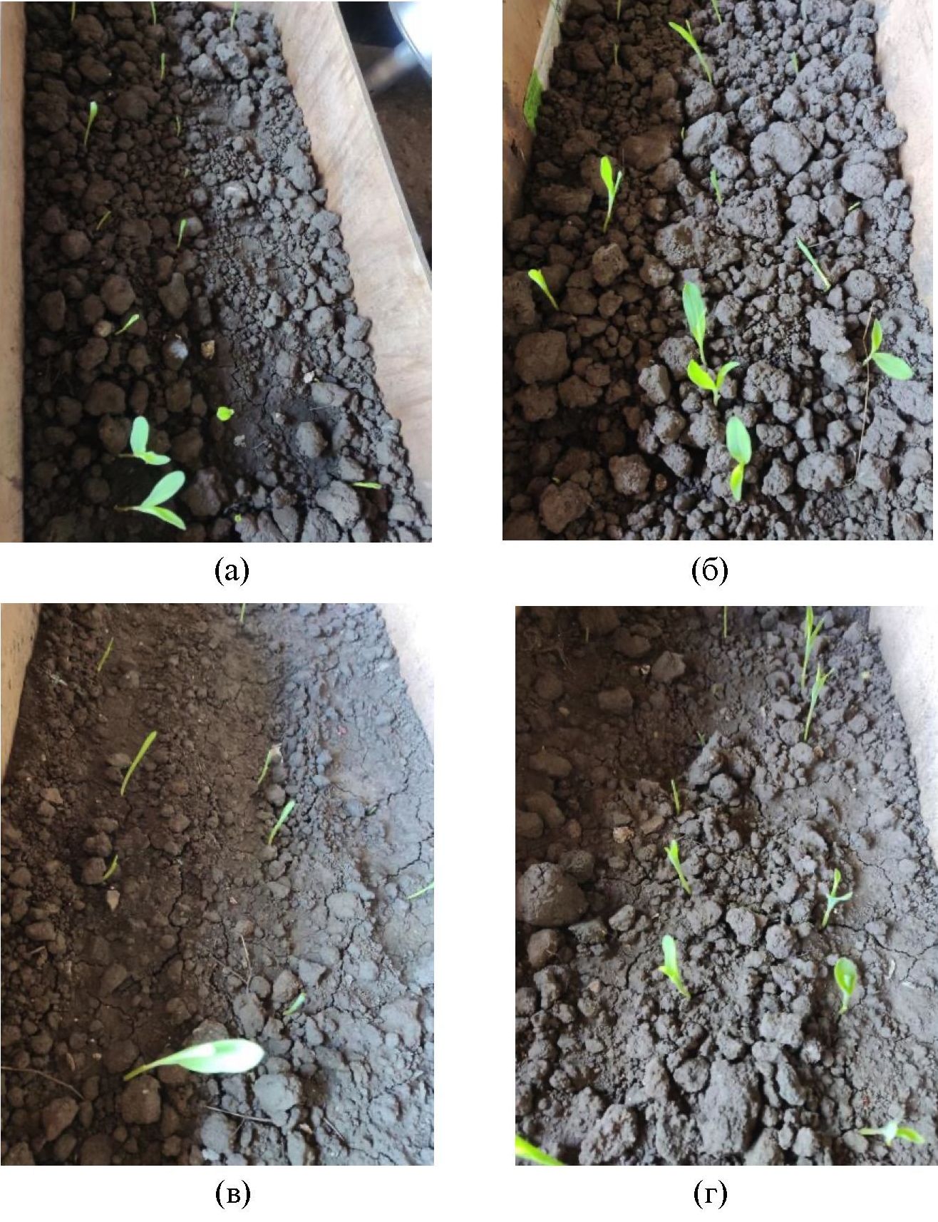 Появление сорной растительности (21-й день). После перемещения образцов на улицу (рис. 3) началось прорастание сорняков в образцах (а) и (б): образец (а) – необработанная почва: на поверхности активно росла сорная растительность, что затрудняло развитие кукурузы. Сорняки конкурировали за питательные вещества и свет, что соответствовало данным [6], где указано, что отсутствие обработки приводит к доминированию сорной растительности; образец (б) – парообработанная почва: количество сорняков меньше, однако их присутствие все еще заметно; образцы (в) и (г) – микроволновая обработка: сорняков не обнаружено, что свидетельствует о высокой эффективности метода в уничтожении семян сорняков.