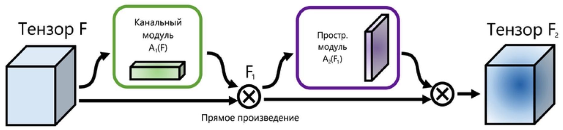 Действие модуля иллюстрирует рис. 2. На вход блока подается множество признаков , где – число каналов, – высота, – длина изображения. Канальный подмодуль принадлежит множеству , а пространственный принадлежит множеству . Применение модуля можно описать соотношениями