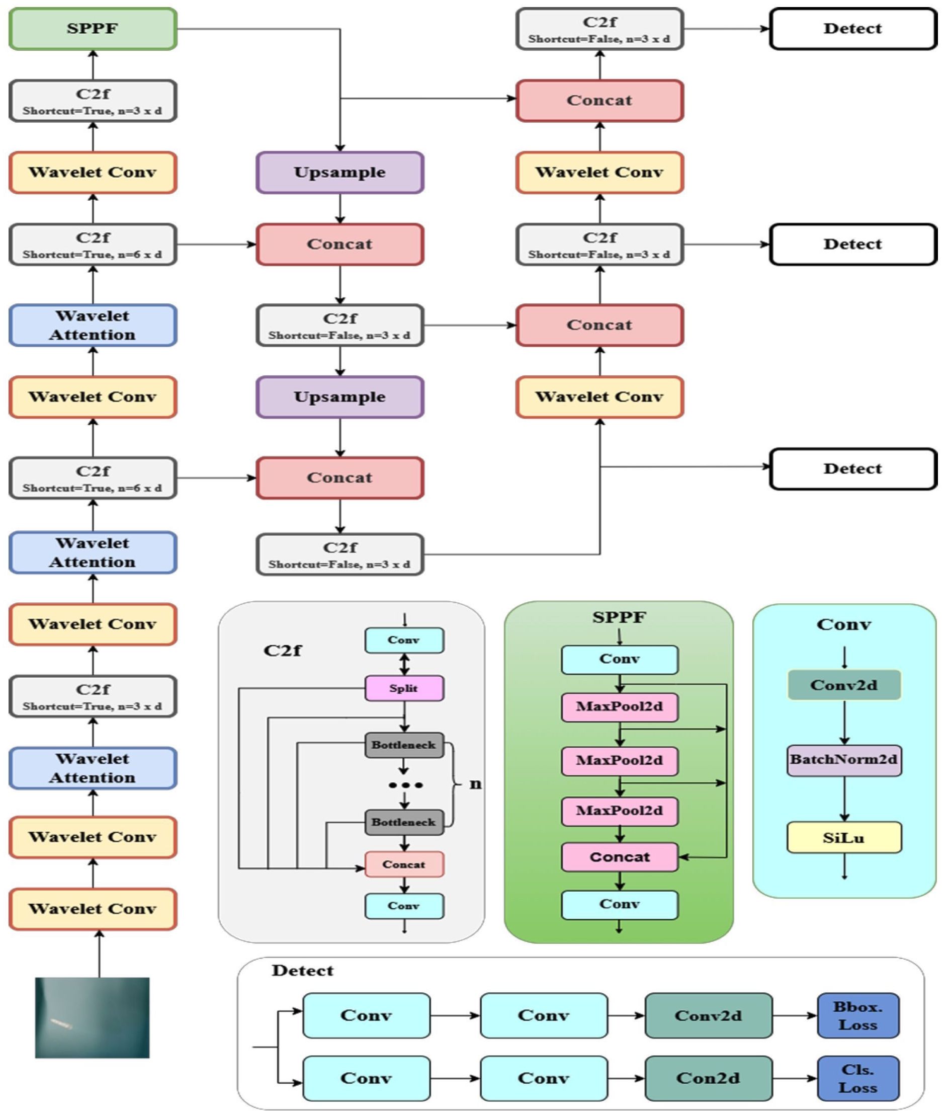 C2f (Cross Stage Partial Network – Faster) в этой архитектуре используется как важный компонент основы для эффективной обработки и извлечения признаков. В частности, C2f работает путем разделения входного потока на две ветви: одна ветвь проходит через серию блоков bottleneck, повторяющихся n раз для изучения сложных признаков, в то время как другая ветвь проходит напрямую для сохранения исходной информации, после чего обе ветви объединяются. В модели блоки C2f настроены с различными параметрами, такими как shortcut=True/False, для управления короткими соединениями и n=3xd для определения количества повторений Bottleneck, что помогает сбалансировать сложность модели и способность извлечения признаков, одновременно оптимизируя скорость обработки по сравнению с традиционной версией CSP. Такая конструкция не только значительно снижает вычислительные затраты, но и сохраняет способность к изучению различительных признаков, что особенно полезно при обработке признаков из Wavelet Conv и подготовке их для последующих этапов детектирования.
