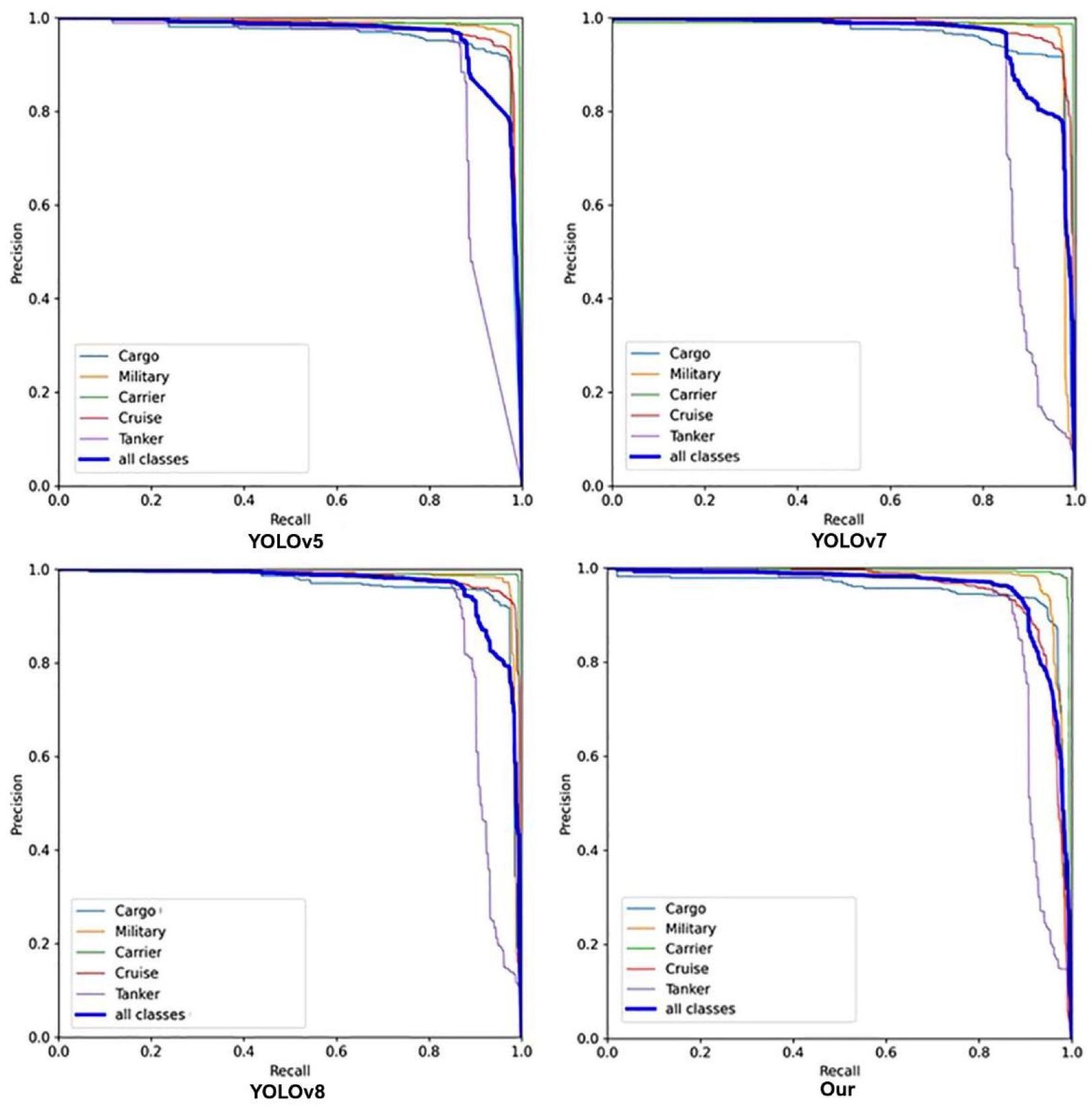 На рисунке 5 показаны кривые (P-R) для YOLOv5, YOLOv7, YOLOv8 и предложенного алгоритма. Кривые P-R представляют собой предсказания положительных образцов тестового набора при различных пороговых значениях. Чем больше площадь, занимаемая кривой P-R и осью координат, тем выше точность и отзыв алгоритма обнаружения. Приведенные данные показывают, что предложенный алгоритм в данной работе лучше, чем три алгоритма YOLOv5, YOLOv7 и YOLOv8 с точки зрения эффективности процесса обнаружения.