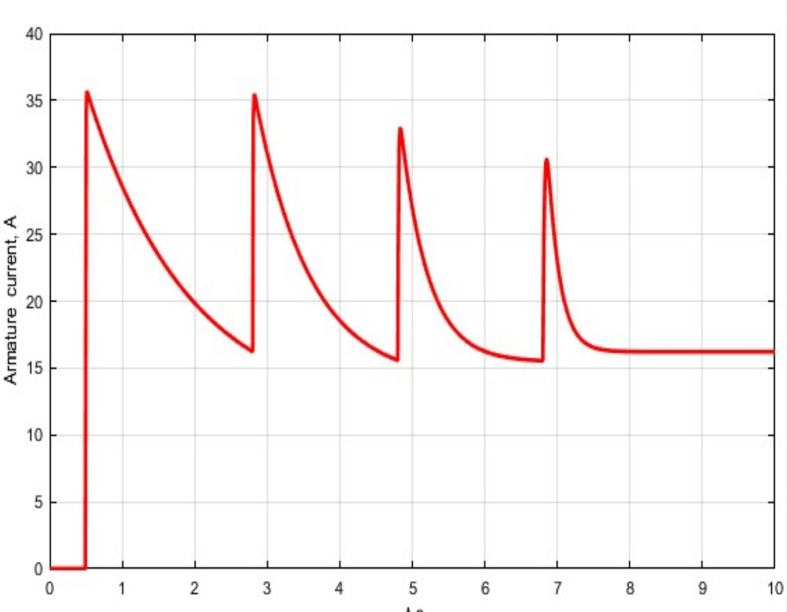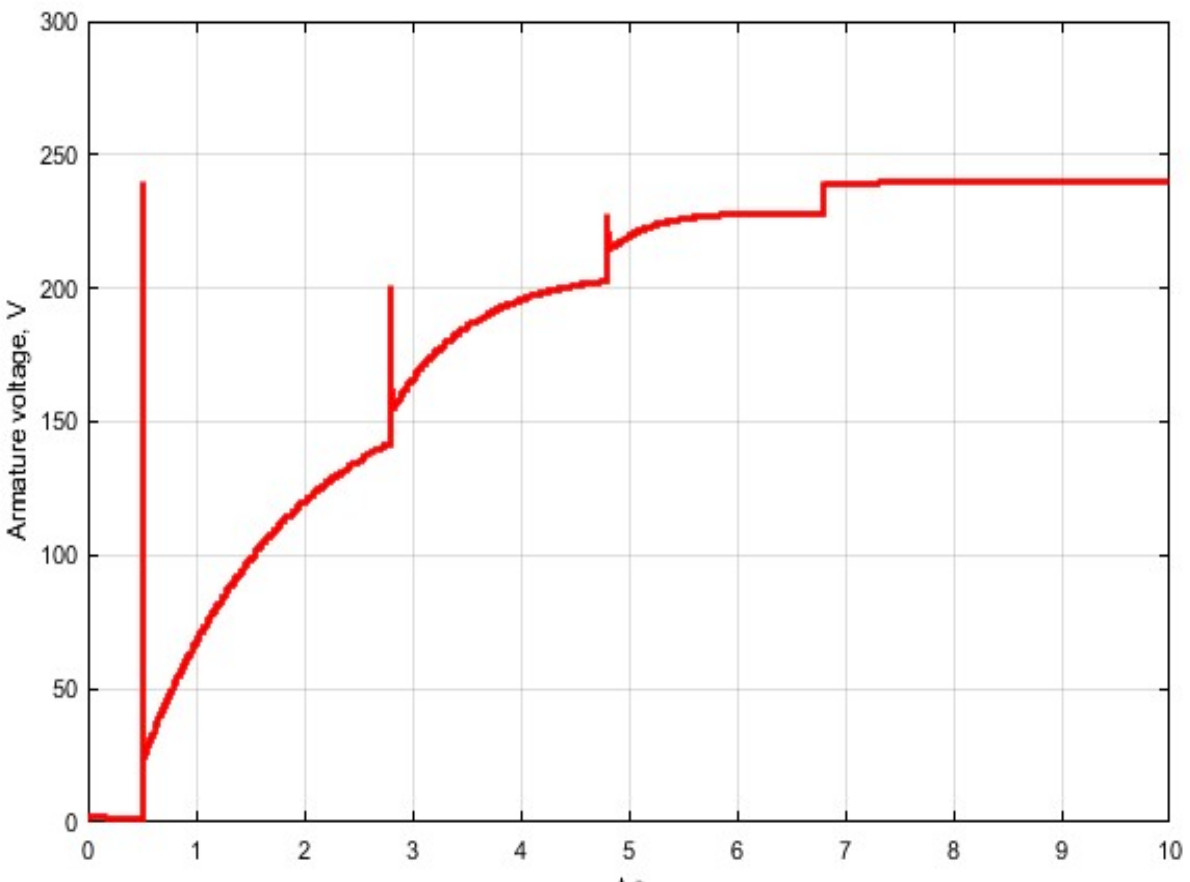 Идентификация параметров на основе уравнений (17) и (18) была реализована в MATLAB и сравнена с методом наименьших квадратов. Значения токов и напряжений получены с помощью модели двигателя постоянного тока в MATLAB Simulink (рис. 1, 2).