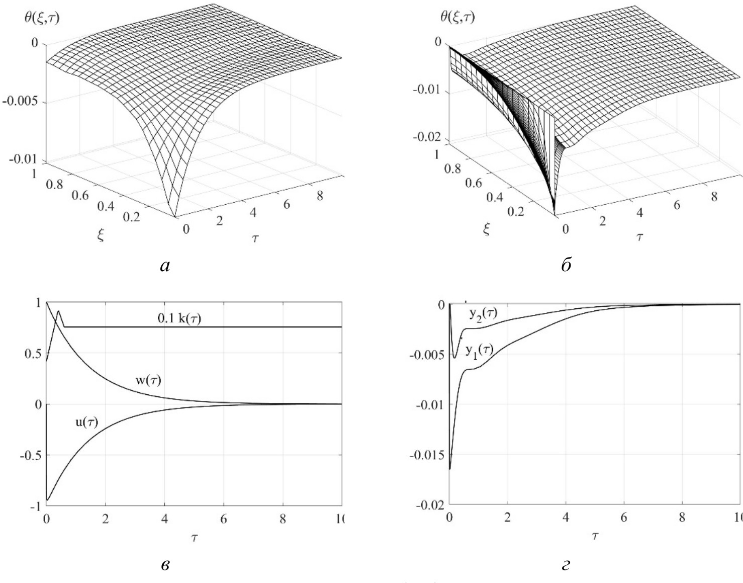 Рис. 5. Результаты анализа: а – функция , полученная по выражению (61); б – функция , полученная при моделировании динамической системы (56), (62); в – управление , возмущение , коэффициент ; г – переходные процессы по переменным