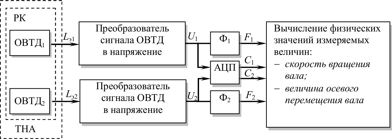 Рис. 2. Обобщенная структурно-функциональная схема системы контроля осевых перемещений и определения скорости вращения вала в РУП