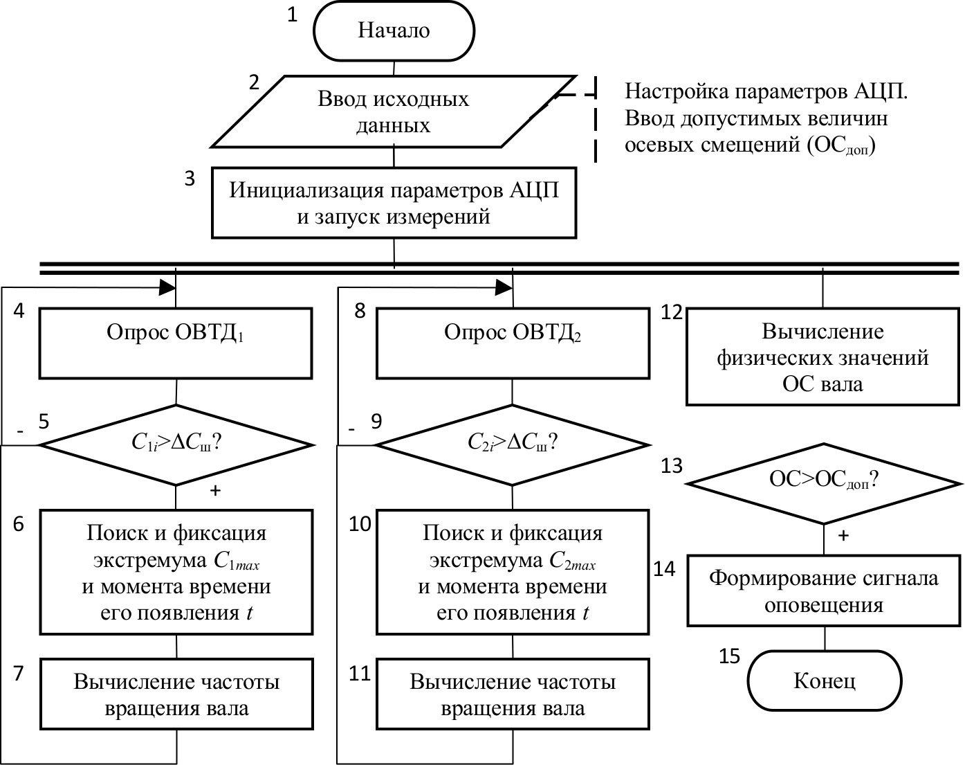 Блок-схема алгоритма общего функционирования системы контроля осевых смещений и определения скорости вращения вала в РУП представлена на рис. 3. Запуск процедур сбора и обработки измерительной информации о диагностических параметрах подшипникового узла начинается после ввода исходных данных (конфигурация используемых технических средств, ГХ измерительных каналов системы, уставки по допустимым осевым смещениям) и инициализации используемых АЦП (блоки 2–3). Цикл опроса ОВТД и вычислений физических значений осевых смещений осуществляется в основном теле алгоритма (блоки 4–14), который реализован в виде трех независимых потоков выполнения, два из которых (блоки 4–7 и 8–11) идентичны по своему программному наполнению и обеспечивают управление сбором, преобразованиями и вычислениями в каждом из измерительных каналов системы. Третий поток (блоки 12–14) осуществляет интеграцию результатов преобразования, вычисление физических значений осевых смещений вала (блок 12), сопоставление полученного результата с заданными установками (блок 13) и формирование соответствующего сигнала оповещения системе автоматического управления двигателем (блок 14).
