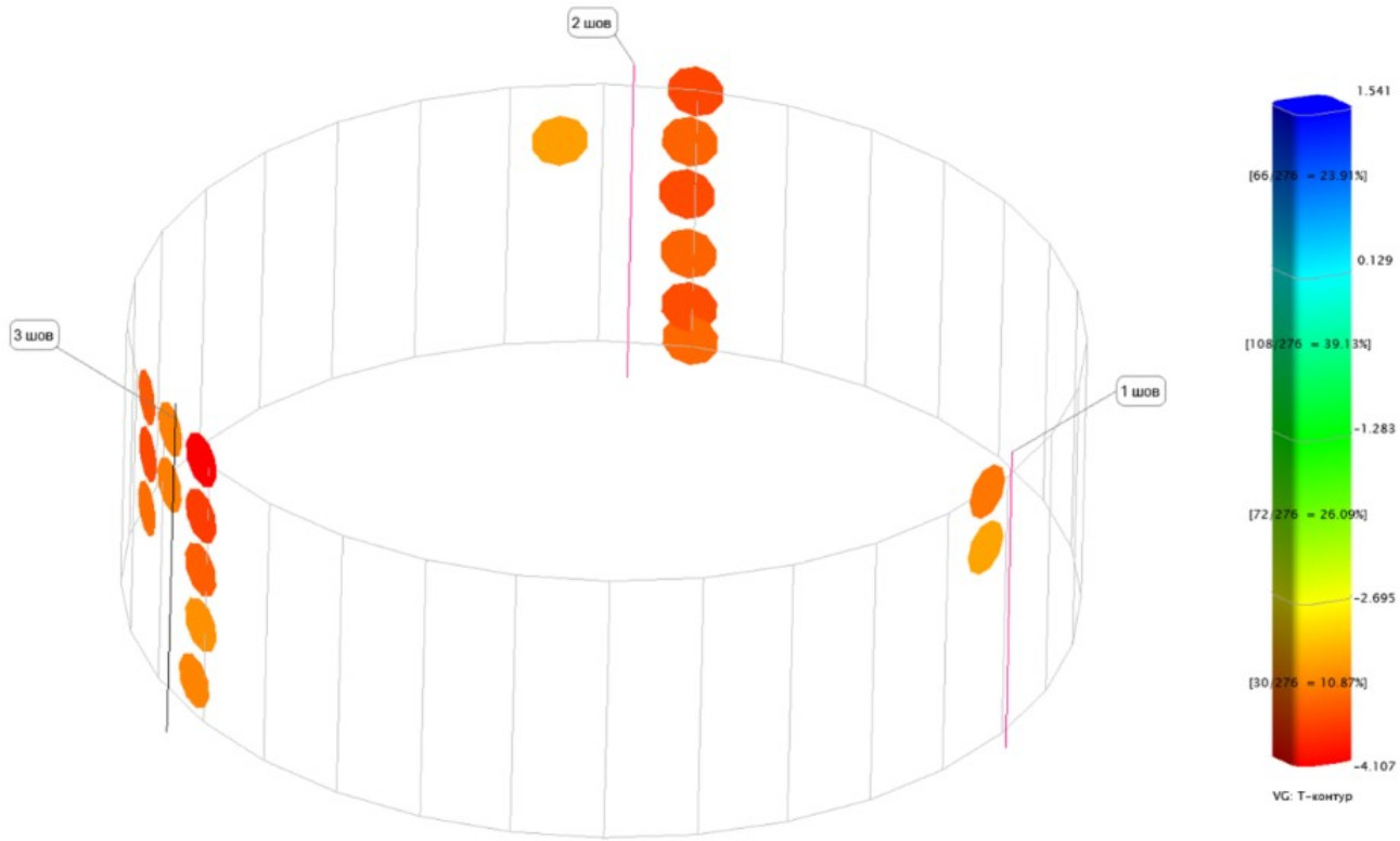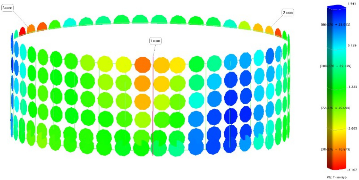 На рис. 9–12 показаны векторы отклонений от действительного размера. Знак «–» в значении отклонения означает, что вектор отклонения направлен внутрь обечайки. Максимальное отклонение от оси обечайки составило +1,541 мм; внутрь – 4,187 мм.
