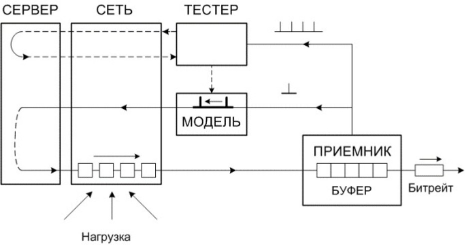 Случайный характер изменения загрузки сети приводит к случайному процессу изменения задержек пакетов видеотрафика и необходимости управления размерами буфера на приемной стороне. Качество регулирования размеров буфера может быть повышено, если в системе управления постоянно учитывать указанные задержки и осуществлять их прогнозирование. Реализация процесса введения сигнала опережения поясняется на рис. 3. Для определения задержек трафика в сети в нее периодически поступают тестирующие пакеты от тестера (в качестве тестирующих могут быть использованы сигналы запроса пакетов). Пакеты, пройдя по сети до сервера и возвратившись обратно, обеспечивают определение круговых задержек сети.