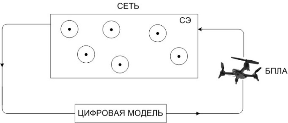 Перспективной технологией подзарядки аккумуляторных батарей, позволяющей значительно увеличить срок службы элементов БСС, в настоящее время является способ подзарядки аккумуляторных батарей в сенсорных сетях при помощи беспилотных летательных аппаратов (БПЛА) [14]. Рассматриваемый способ основан на концепции цифровых двойников.