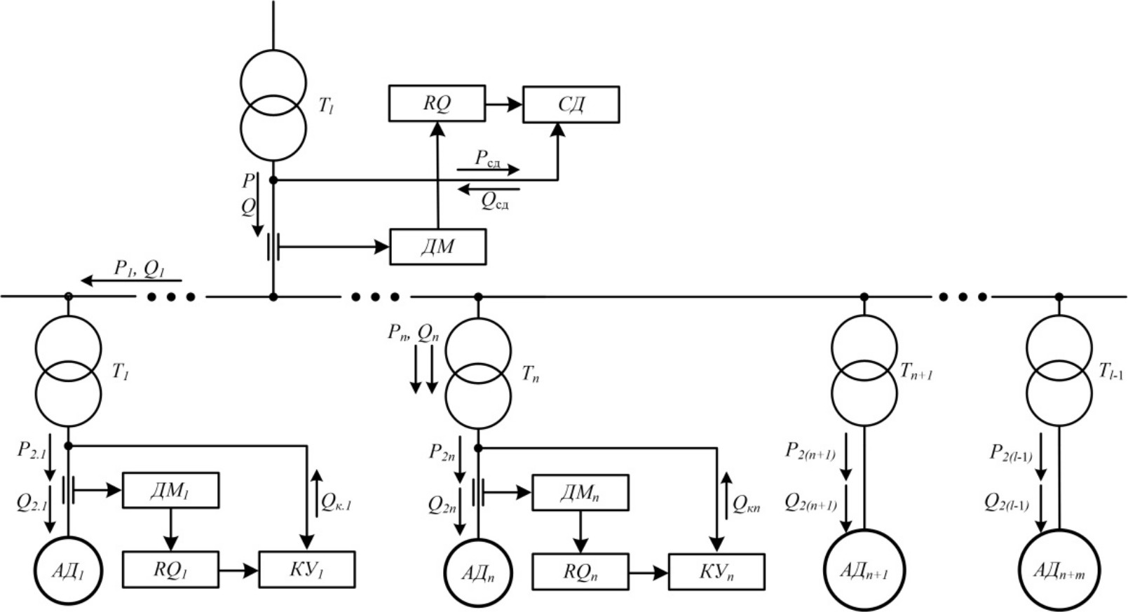 Обозначения на схеме: – трансформаторы цеховых подстанций; – трансформатор главной понизительной подстанции; – датчики активной и реактивной мощности; – асинхронные двигатели; – регуляторы реактивной мощности; – конденсаторные установки; СД – синхронный двигатель; .