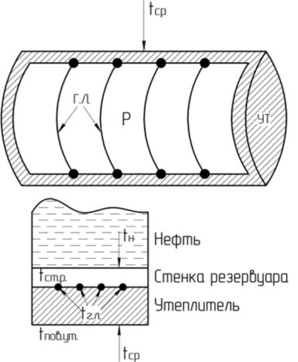 На рис. 1: tср – температура окружающей среды; Г.Л. – греющая лента; Р – резервуар; УТ – утеплитель; tн – температура нефти; tст.р. – температура стенки резервуара; tпов.ут. – температура поверхности утеплителя; tг.л. – температура греющей ленты