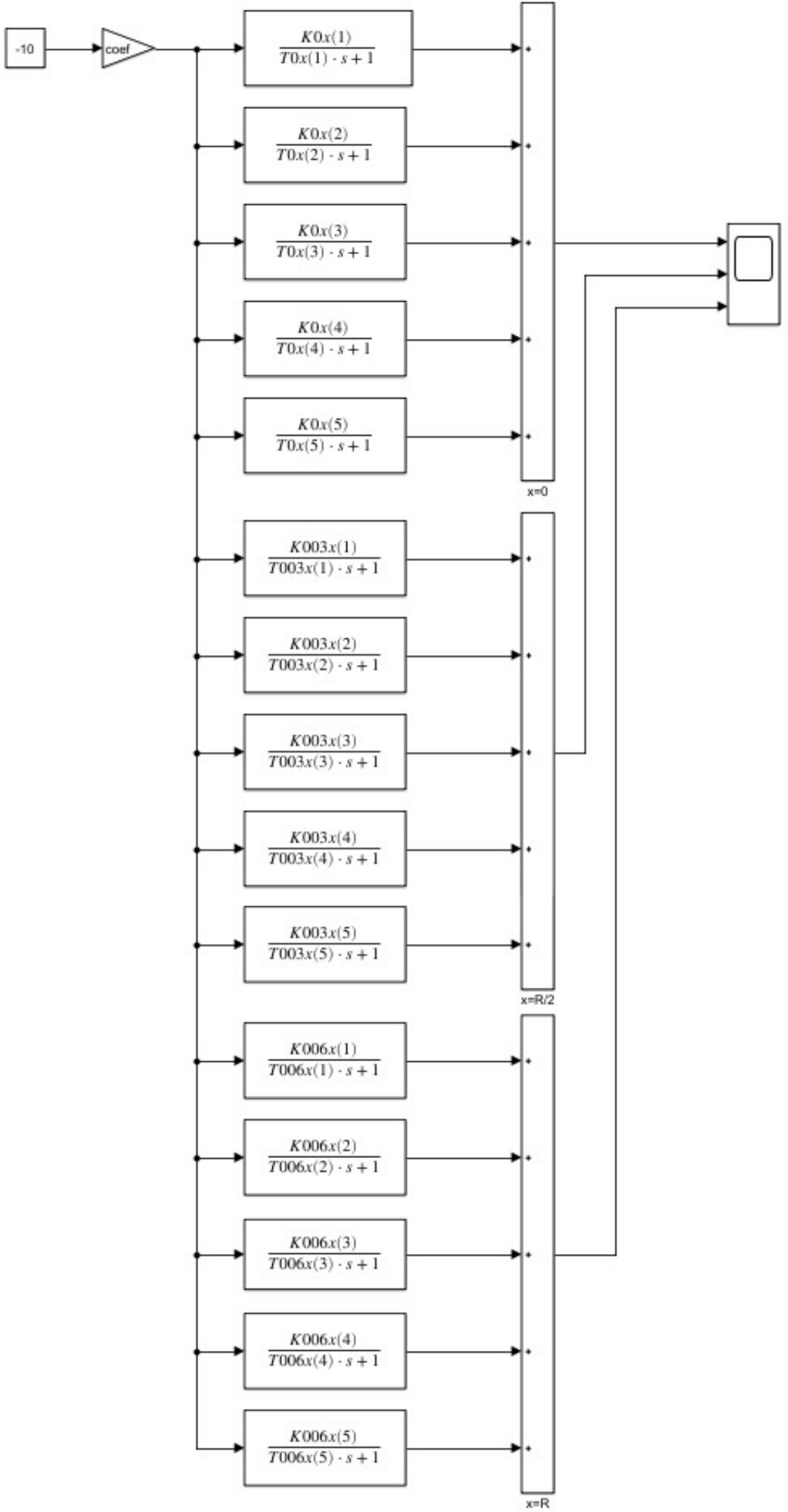 Таким образом, можно ограничиться укороченной структурой, отбросив последние элементы, так как они не будут существенно влиять на точность модели объекта. При моделировании рассматриваемого объекта достаточным оказалось использование пяти апериодических звеньев в структуре.