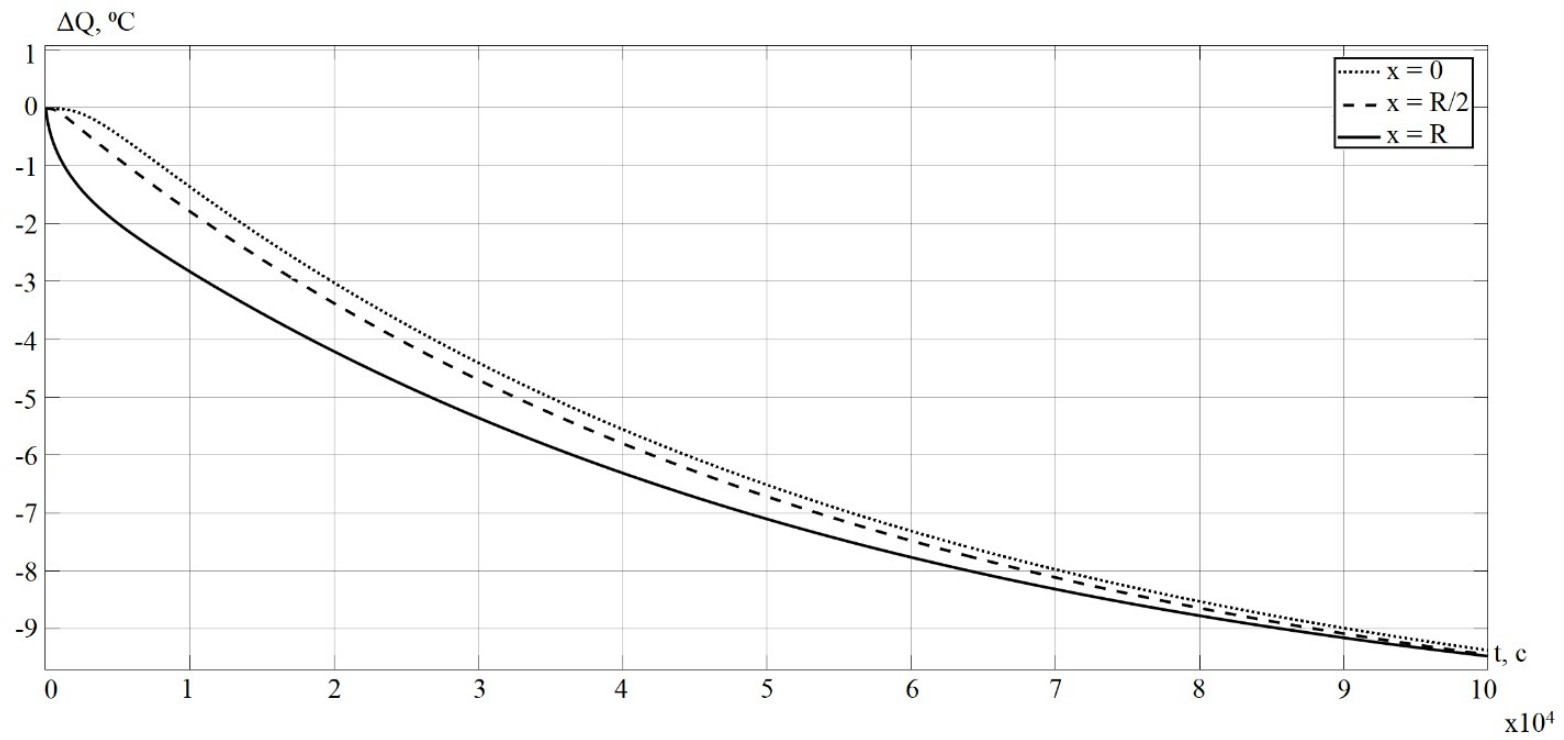 Выходной величиной приведенной модели являются функции изменения температуры от времени в трех точках: поверхность теплоизоляции со стороны окружающей среды (R), середина слоя теплоизоляции (R/2), поверхность утеплителя, прилегающая к стенке резервуара (0). Управляющим воздействием для представленной модели на данном этапе работы является температура воздуха, воздействующая со стороны R.