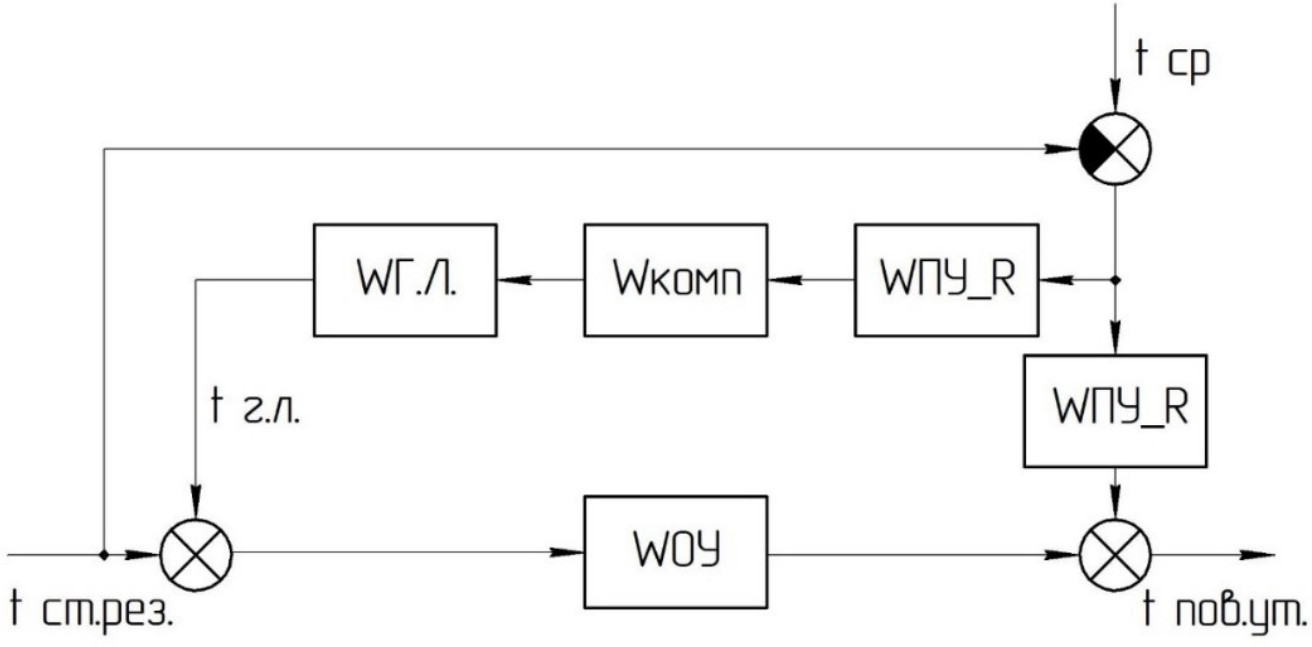 Рис. 5. Структурная схема системы компенсации тепловых потерь с поверхности резервуара: WОУ – передаточная функция объекта управления (слой утеплителя); WПУ_R – передаточная функция поверхности утеплителя при воздействии окружающей среды; WГ.Л. – передаточная функция греющей ленты; Wкомп – передаточная функция компенсационного элемента