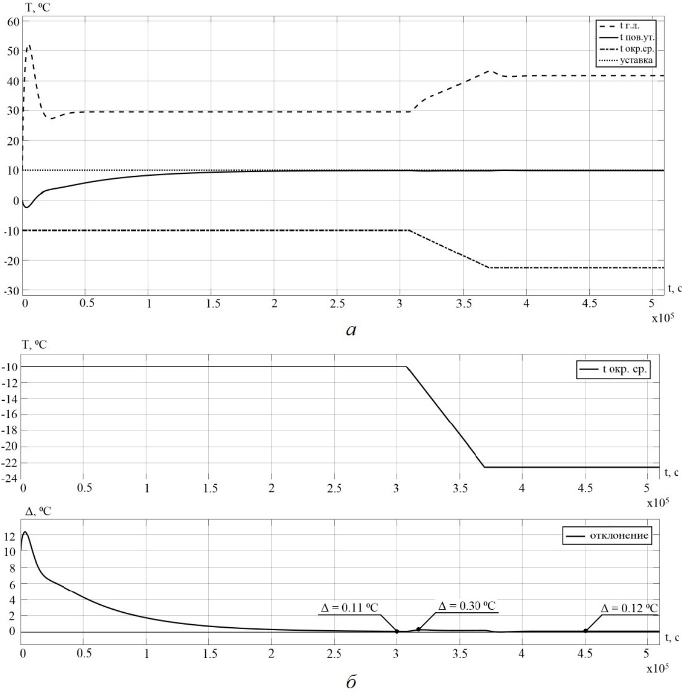 Рис. 6. Переходные характеристики системы поддержания температуры (а), график отклонения температуры поверхности утеплителя от требуемой (б)