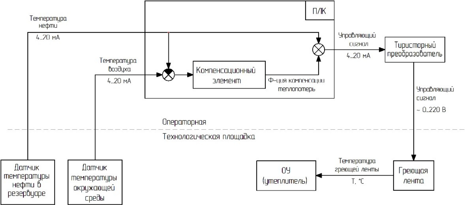 В начале работы программы на контроллер поступает информация с установленного в резервуаре датчика температуры о текущей температуре среды, которую в дальнейшем необходимо поддерживать. В программе ПЛК реализуется компенсационный элемент, который на основе начальной температуры среды и текущей температуры окружающего воздуха рассчитывает требуемую функцию динамики мощности нагрева греющего кабеля и вырабатывает управляющее воздействие, меняющее мощность нагрева греющего кабеля.