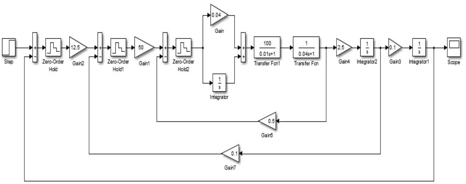 При формировании схемы принят период дискретности экстраполятора нулевого порядка T0I = 0,00628 с. Это же значение дискретности использовалось при формировании схем в форме Z-преобразования.