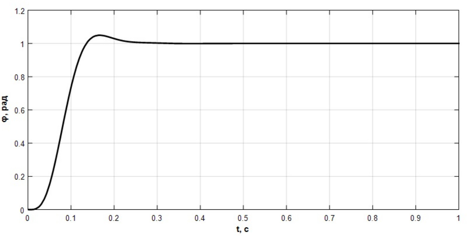 Значение дискретности экстраполятора для каждого контура рассчитывалась из условия . Анализ динамических показателей качества управления [12] показывает на то, что для переходного процесса на рис. 8. значения перерегулирования σ%=5% и время переходного процесса tpp = 0.13 с.Эти показатели близки к показателям аналогового прототипа.
