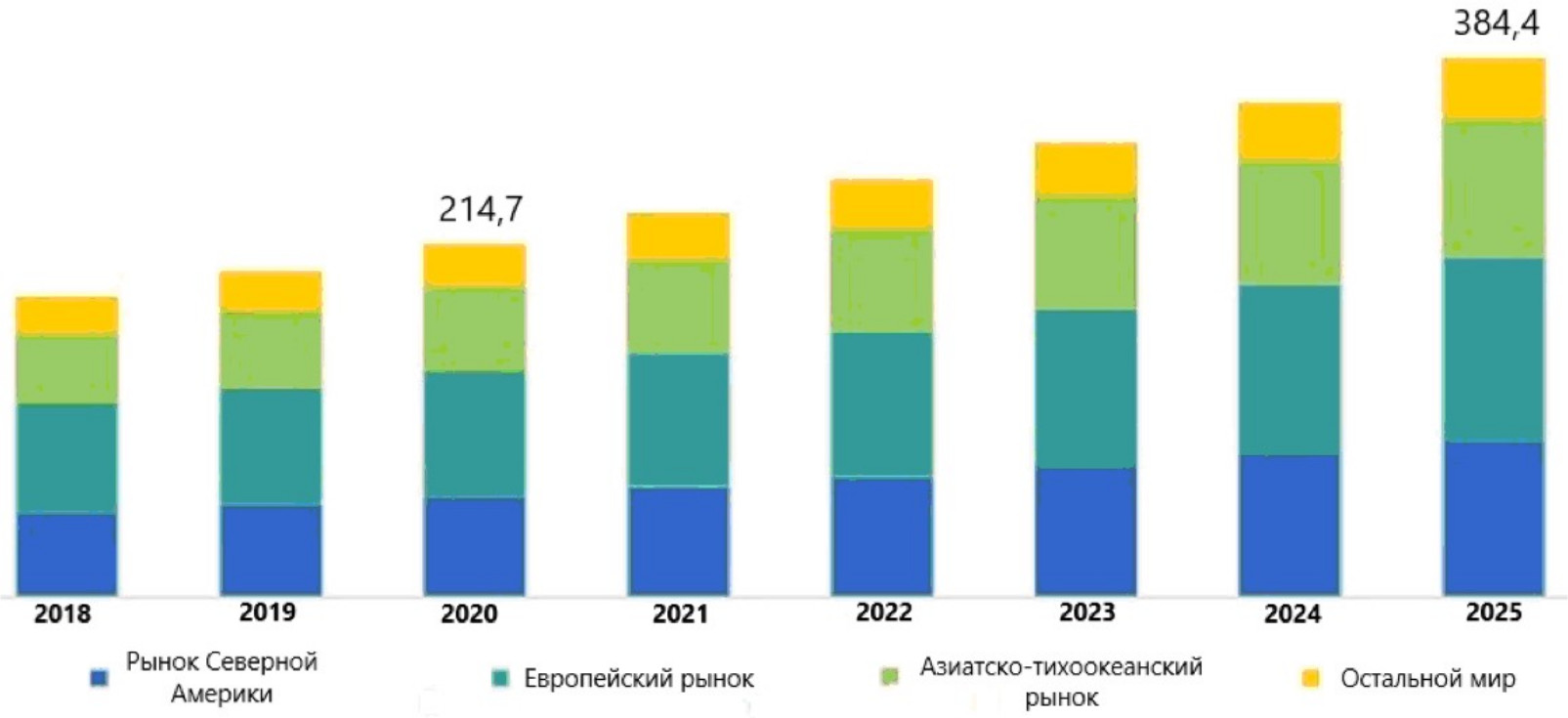 Актуальность цифровой модернизации промышленности подтверждается анализом рынка умного производства, проведенным одной из крупнейших исследовательских аналитических компаний MarketsandMarkets [2]. Согласно данным проведенного исследования рыночная капитализация цифровой промышленности достигнет к 2025 г. около 384,8 млрд. долл., при этом среднегодовой прирост составит 12,4%. Динамика изменения объемов рыночной капитализации умного производства на глобальных мировых рынках представлена на рис. 1.