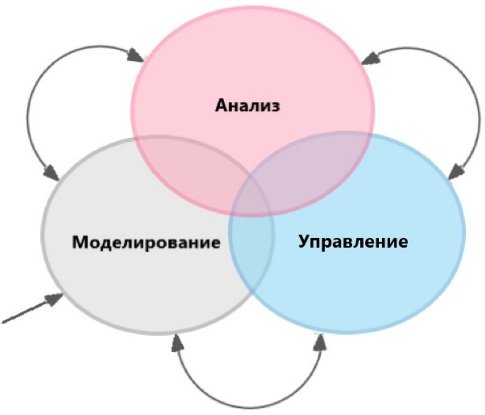 Функционирование киберфизической системы управления технологическим процессом может быть представлено как взаимодействие ее основных подсистем, описанных выше. Несмотря на сложность и многоцелевую направленность функционального назначения подсистем КФСУ ТП, все выполняемые подсистемами функции могут быть условно разделены на три основные реализуемые системой задачи: моделирование, управление и анализ [15] (рис. 2).
