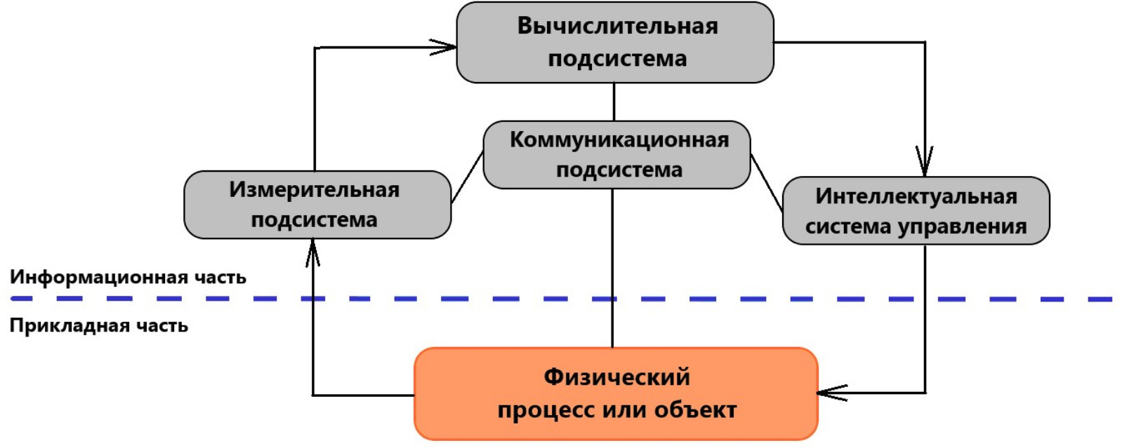 Киберфизические системы имеют два иерархических уровня: вычислительный (информационный) и прикладной (физический) [16]. Это в полной мере относится и к КФСУ ТП. При этом к информационному уровню относятся вычислительная, измерительная, управляющая и коммуникационная подсистемы, а к прикладному – физический процесс или объект управления.