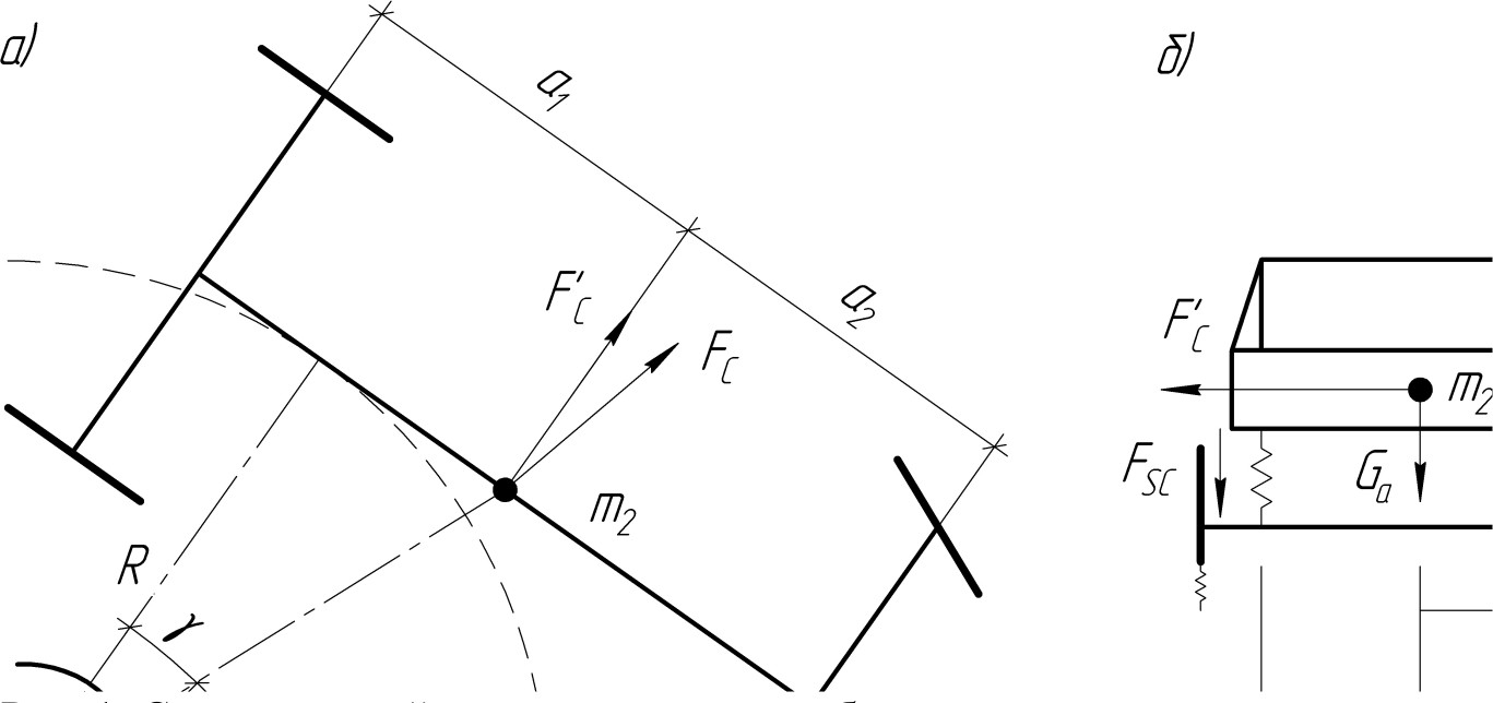 Расположение центра масс по поперечной оси автомобиля относительно точек крепления подрессоренной части автомобиля к подвескам обозначим (рис. 1, б). Значение для передней и задней ходовых осей может отличаться. В таком случае при расчете усилий значение применяется для соответствующей оси. Центр масс может располагаться ниже точек крепления подрессоренной части автомобиля к подвескам. В этой ситуации направление вектора силы , действующей на подвеску при повороте, изменится на противоположное.