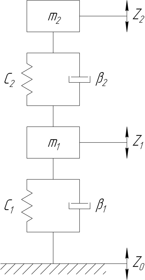 Для исследования динамики объекта управления должны быть учтены упруго-диссипативные свойства подвески. Используем расчетную схему двухмассовой колебательной системы, представленную на рис. 2, где обозначено: , – неподрессоренная и подрессоренная масса; , и , – жесткости и коэффициенты вязкого трения неподрессоренных и подрессоренных элементов подвески соответственно; , , – перемещения неподрессоренной и подрессоренной масс и кинематическое воздействие со стороны дорожного полотна соответственно.