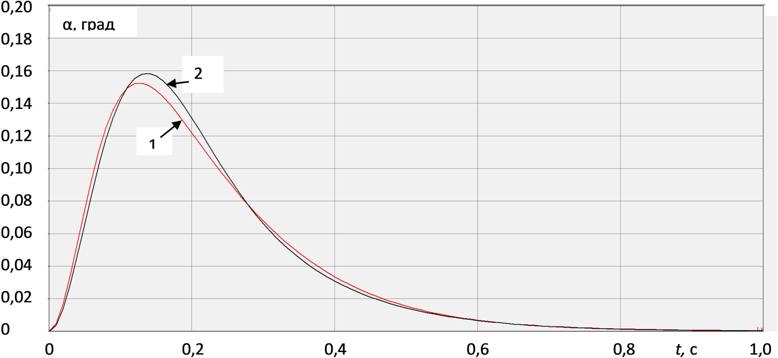 Рис. 6. Графики отработки ступенчатого возмущения: кривая 1 – для расчетных значений параметров; кривая 2 – при увеличении массы на 30 %