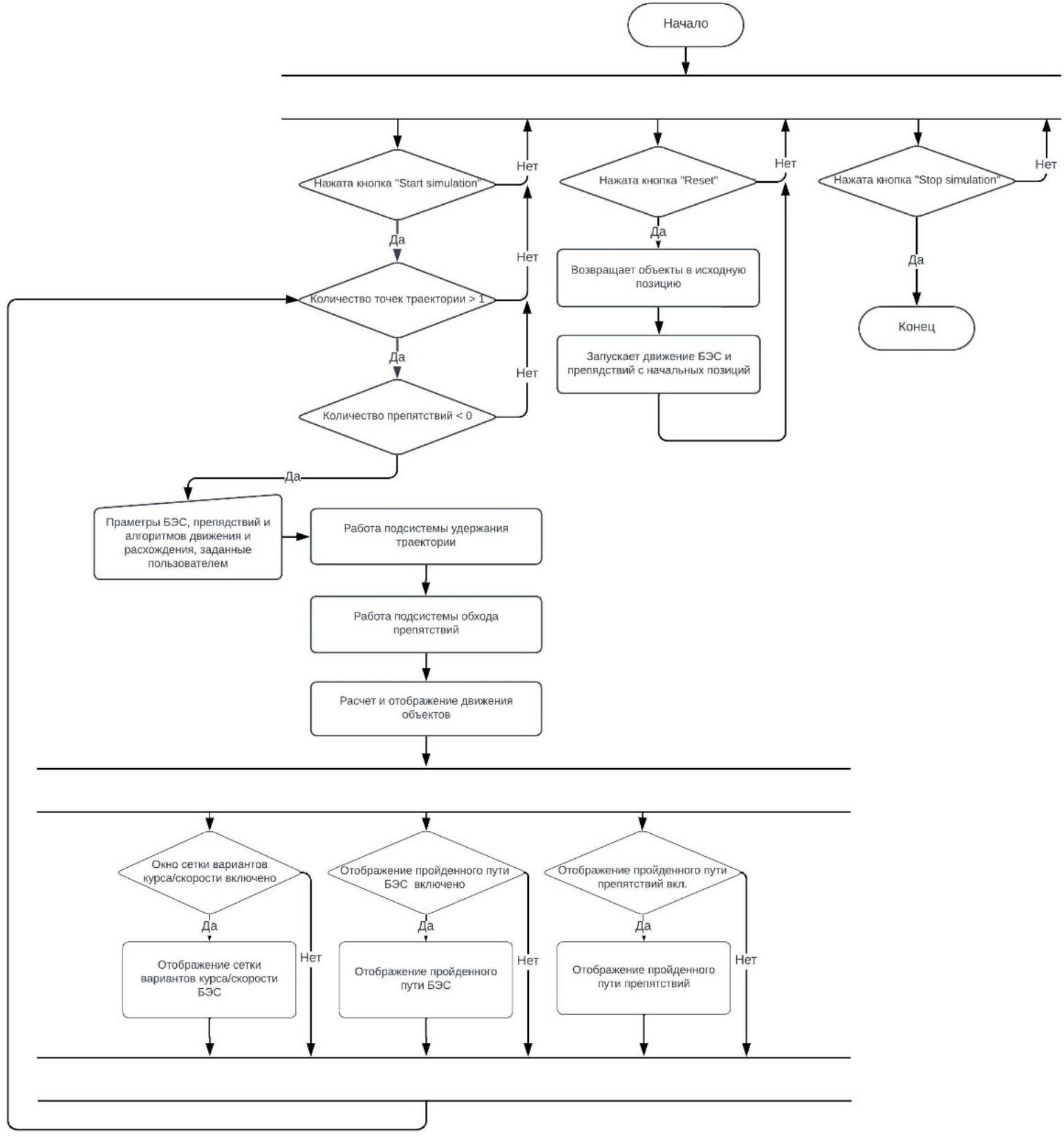 Важнейшим требованием к симулятору является разработка такой структуры программы, базовые элементы которой без изменений возможно использовать в программном обеспечении бортовых систем управления безэкипажных судов. К таким элементам можно отнести программные модули и функции, реализующие алгоритмическую часть движения и принятия решений при маневрах расхождения. Язык программирования также должен быть использован тот, который далее планируется использовать в бортовой системе управления БЭС, или наиболее подходящий и распространенный в данном применении, в том числе позволяющий обрабатывать значительный объем данных и вычислений при ограниченных аппаратных ресурсах.