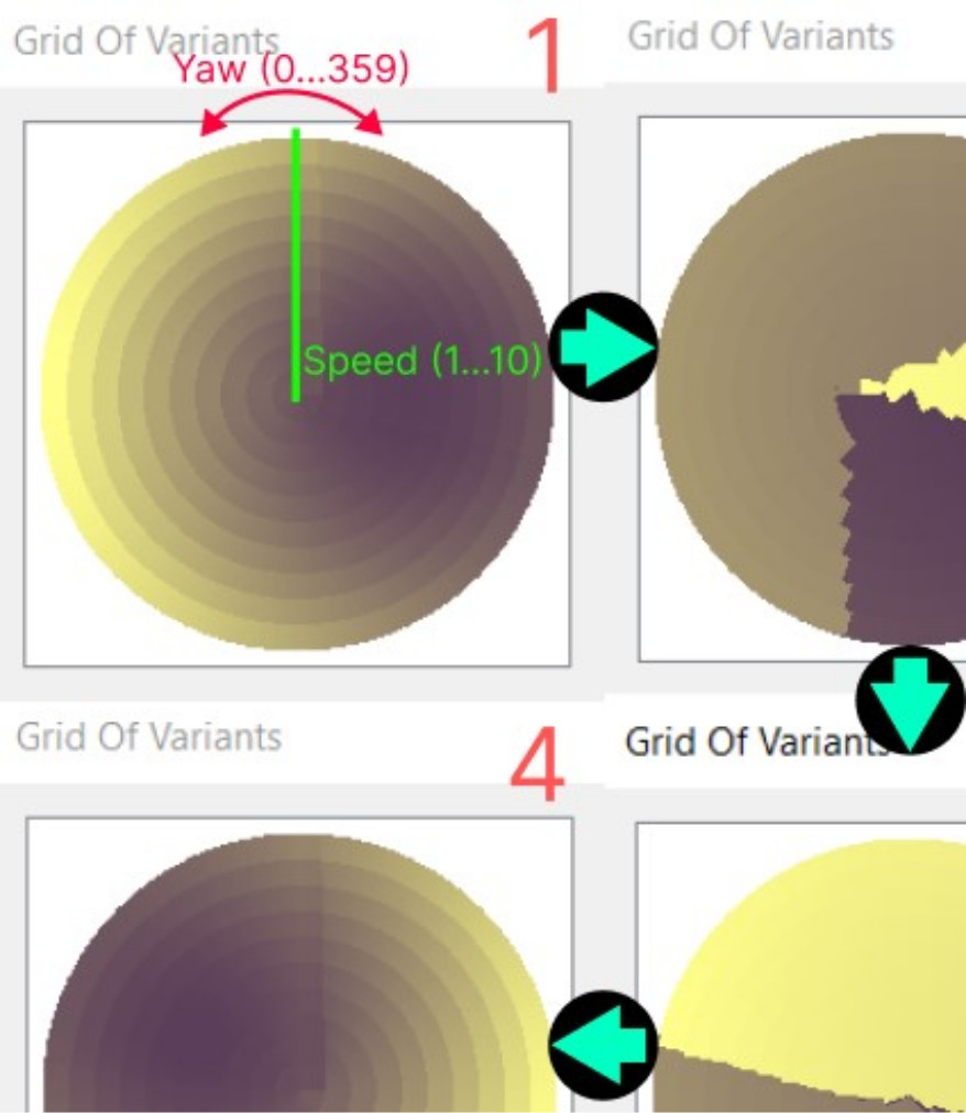 Представленная сетка вариантов показывает, какие области движения являются безопасными, а какие приводят к угрозе столкновения. Она представляет собой окружность, где градусная мера – курс движения судна, а радиус – скорость движения судна, как показано в области 1. Фиолетовые оттенки показывают области, которые являются приоритетными для БЭК, а желтые оттенки показывают области, которые приводят к угрозе столкновения, к нарушению правил МППСС-72 или к отклонению от траектории движения. Цвета определяются значением стоимостной функции, где наименьшее значение показывает наиболее подходящие курс и скорость движения безэкипажного судна.