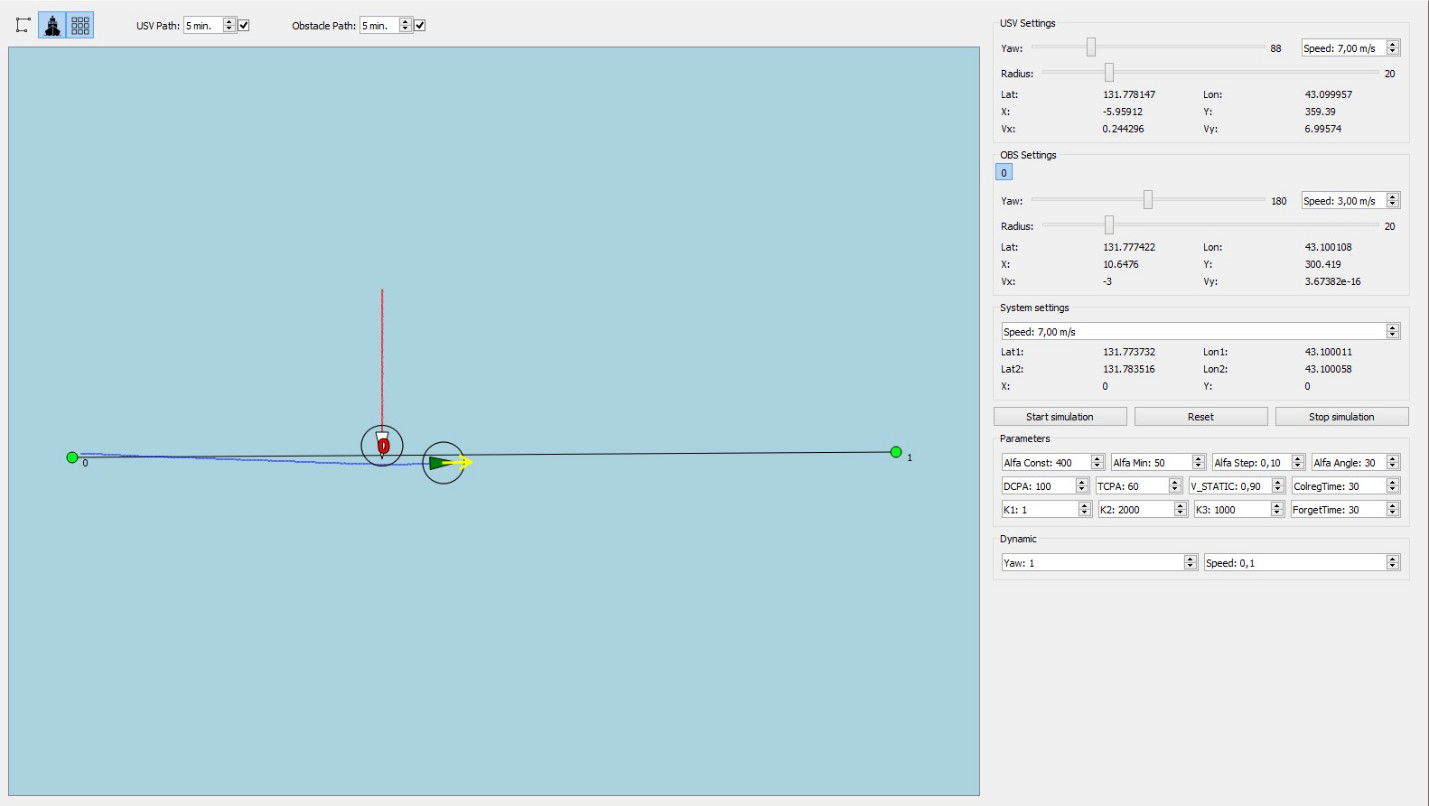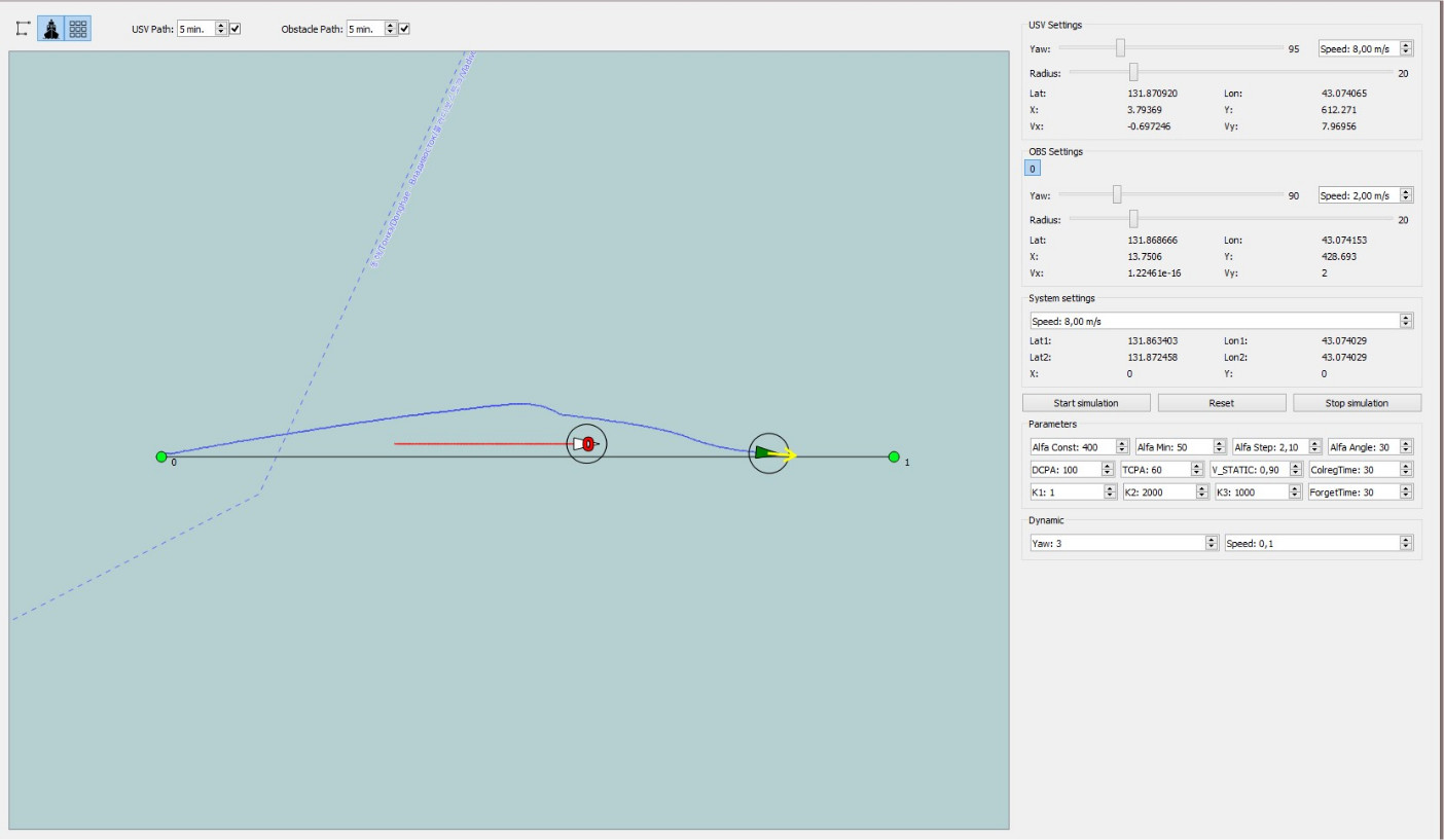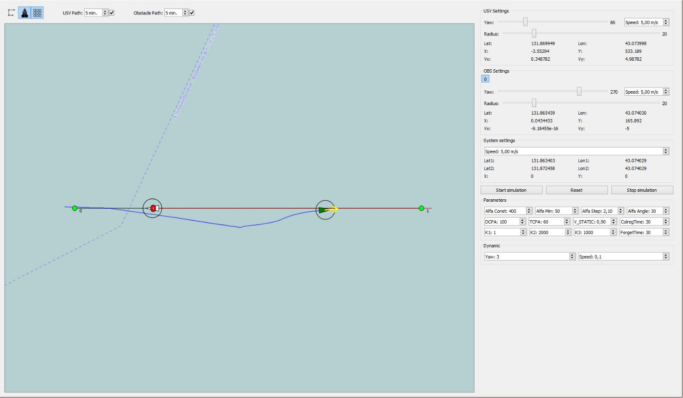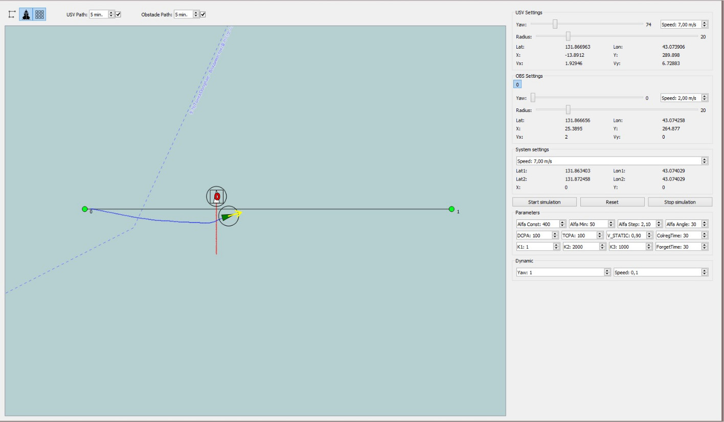 Начальные положения БЭС и препятствий также задаются пользователем на карте интерактивно. Динамика безэкипажного судна (динамика изменения курса и скорости) в симуляторе реализована в упрощенной форме. Переход судна с одной скорости на другую определяется ускорением, задаваемым пользователем. Также задается угловая скорость для реализации изменения курса БЭС. При нажатии на кнопку начала симуляции производится выполнение алгоритмов подсистемы удержания траектории и подсистемы обхода препятствий, расчет и отрисовка перемещения безэкипажного судна и препятствий на карте.