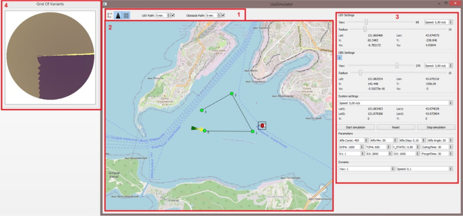 Рис. 2. Графический интерфейс программного симулятора (1 – панель инструментов; 2 – виртуальная карта с расположенными на ней БЭС, препятствием и заданным маршрутом движения БЭС; 3 – панель ввода параметров БЭС, препятствий и алгоритмов движения и расхождения; 4 – графическое отображение стоимостной функции сетки вариантов курсов и скоростей БЭС)