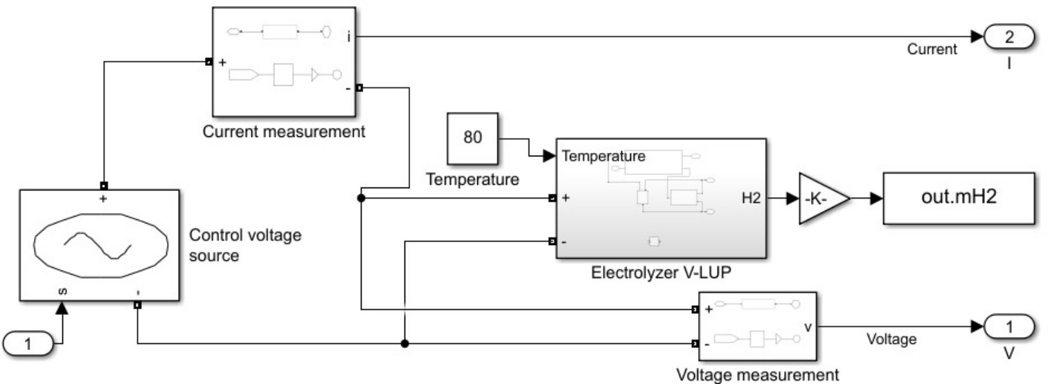 Экспериментальные данные, полученные с реальной физической установки, записываются в виде массива в блок табличного хранения данных «2-D Lookup Table», на вход которого подаются параметры температуры питательной воды или электролита и напряжения, а выходной величиной является сила тока [16].