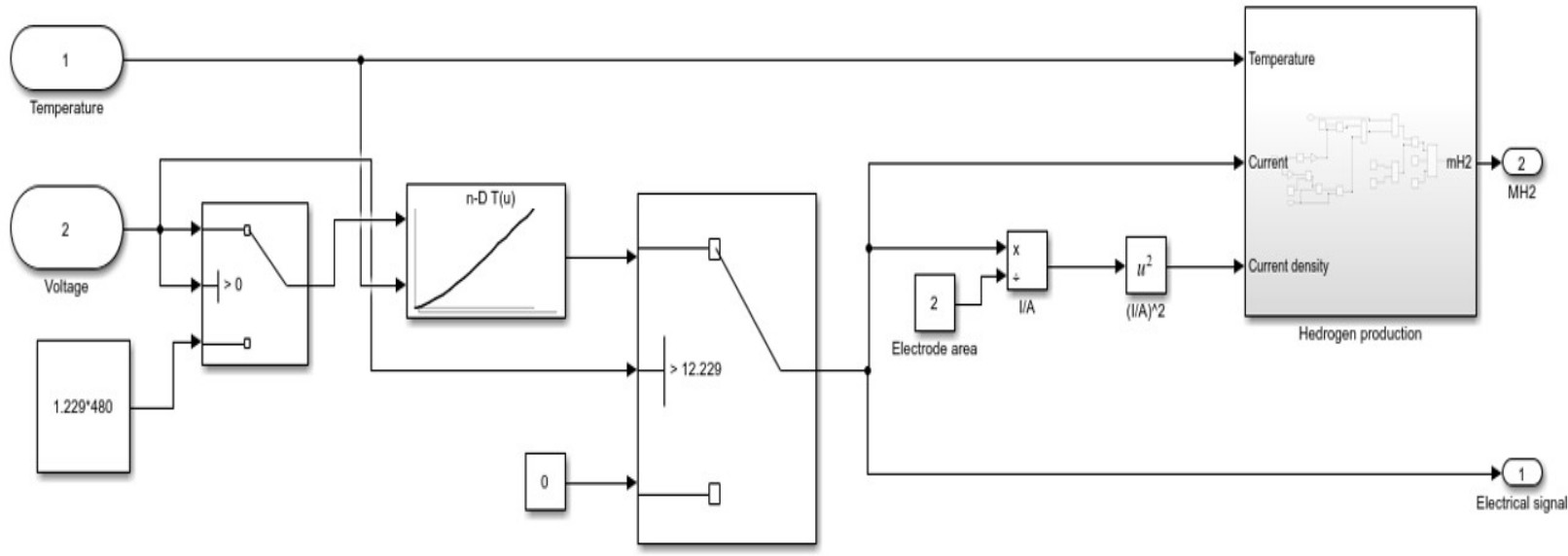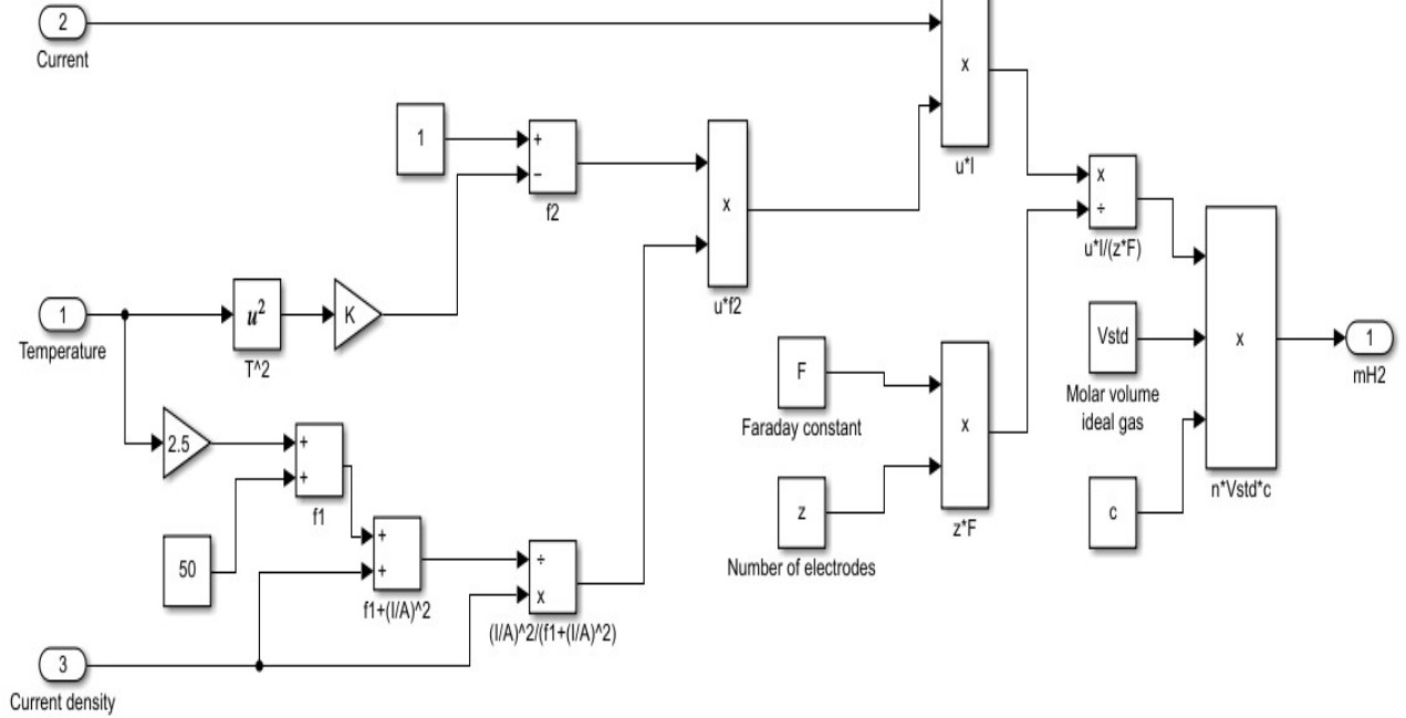 Величины температуры, силы и плотности электрического тока являются входными для третьего уровня вложенности модели (рис. 5), на котором происходит расчет количества вырабатываемого водорода согласно выражению (5).
