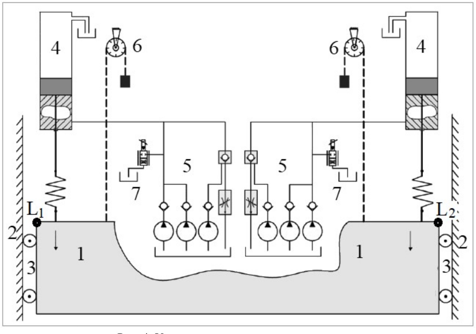 Упрощенная схема системы подъема ворот представлена на рис. 4. Ворота 1 перемещаются по направляющим 2 с помощью подпружиненных тележек 3. Положение «левой» и «правой» сторон ворот может быть представлено координатами L1 и L2. При рассинхронизации работы гидроподъемников возможно образование перекоса ворот, приводящее к их заклиниванию и выходу из строя. По нормативам перекос между сторонами ворот |L1 – L2| не должен превышать 60 мм.