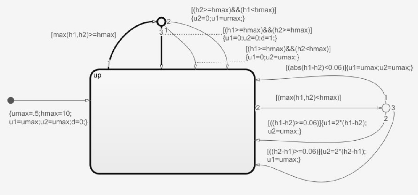 Система правил работы цифрового позиционного регулятора на каждом временном шаге задается следующим образом: «если max(L1, L2) < 10 м и |L1 – L2| ≤ 0,06 м, то u1(t) = umax, u2(t) = umax», «если max(L1, L2) < 10 м и L1 – L2 > 0,06 м, то u1(t) = 2(L1, L2), u2(t) = umax», «если max(L1, L2) < 10 м и max(L1, L2) < 10 м и L2 – L1 > 0,06 м, то u1(t) = umax, u2(t) = 2(L1 – L2)», «если L1 ≥ 10 м и L2 < 10 м, то u1(t) = 0, u2(t) = umax», «если L2 ≥ 10 м и L1 < 10 м, то u2(t) = 0, u1(t) = umax», «если L2 ≥ 10 м и L1 ≥ 10 м, то u1(t) = 0, u2(t) = 0», t ∈ [ti, ti+1), i = 0,1, ... Q – 1.
