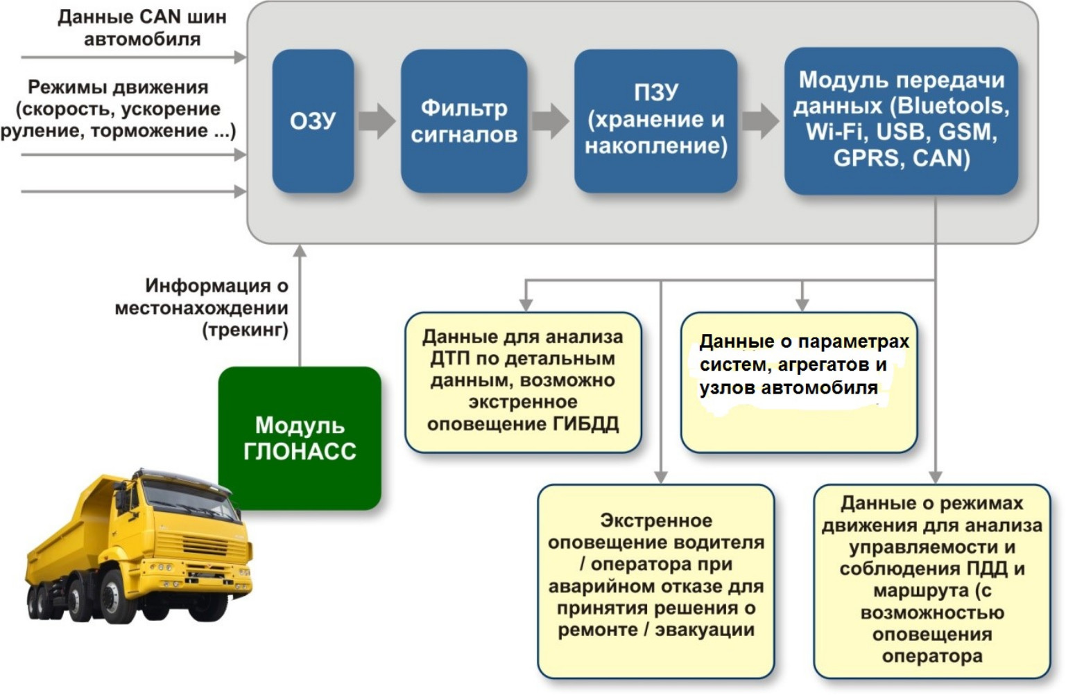Бортовая система связи при помощи средств связи Wi-Fi, Bluetooth, GPRS и шины CAN отправляет накопленную информацию об устройствах автомобиля на блок управления. Переданная информация используется для достоверной оценки работоспособности и безопасности автомобиля, его отдельных узлов, а также позволяет спрогнозировать его незапланированное техническое обслуживание.