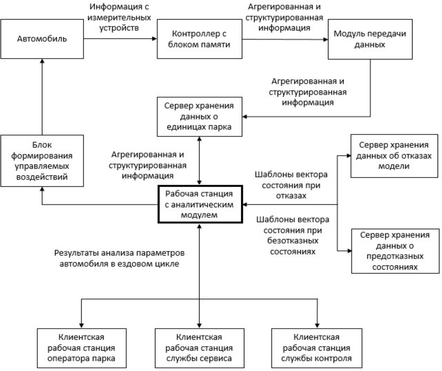 Для прогнозирования отказов и выявления технического состояния автомобиля авторами была разработана рабочая станция с аналитическим модулем (на рис. 2 выделена жирной рамкой). В процессе разработки аналитического модуля были использованы следующие методики: