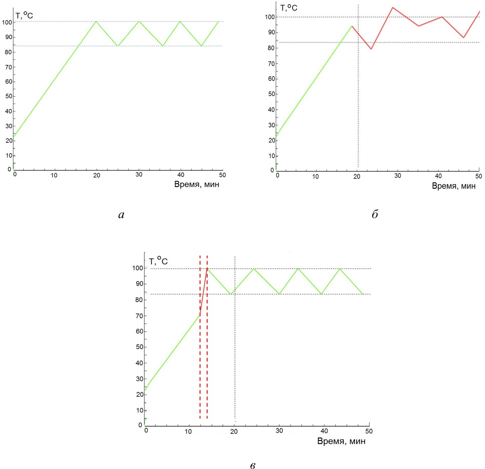 Был проведен анализ возможности диагностики термостата на основе первичных данных, полученных в рамках моделирования систем двигателя шасси КАМАЗ. На рис. 3, а показано нормальное функционирование системы охлаждения для режима «прогрев без движения». На рис. 3, б и рис. 3, в приведены графики температуры охлаждающей жидкости (антифриза) при нештатных ситуациях.