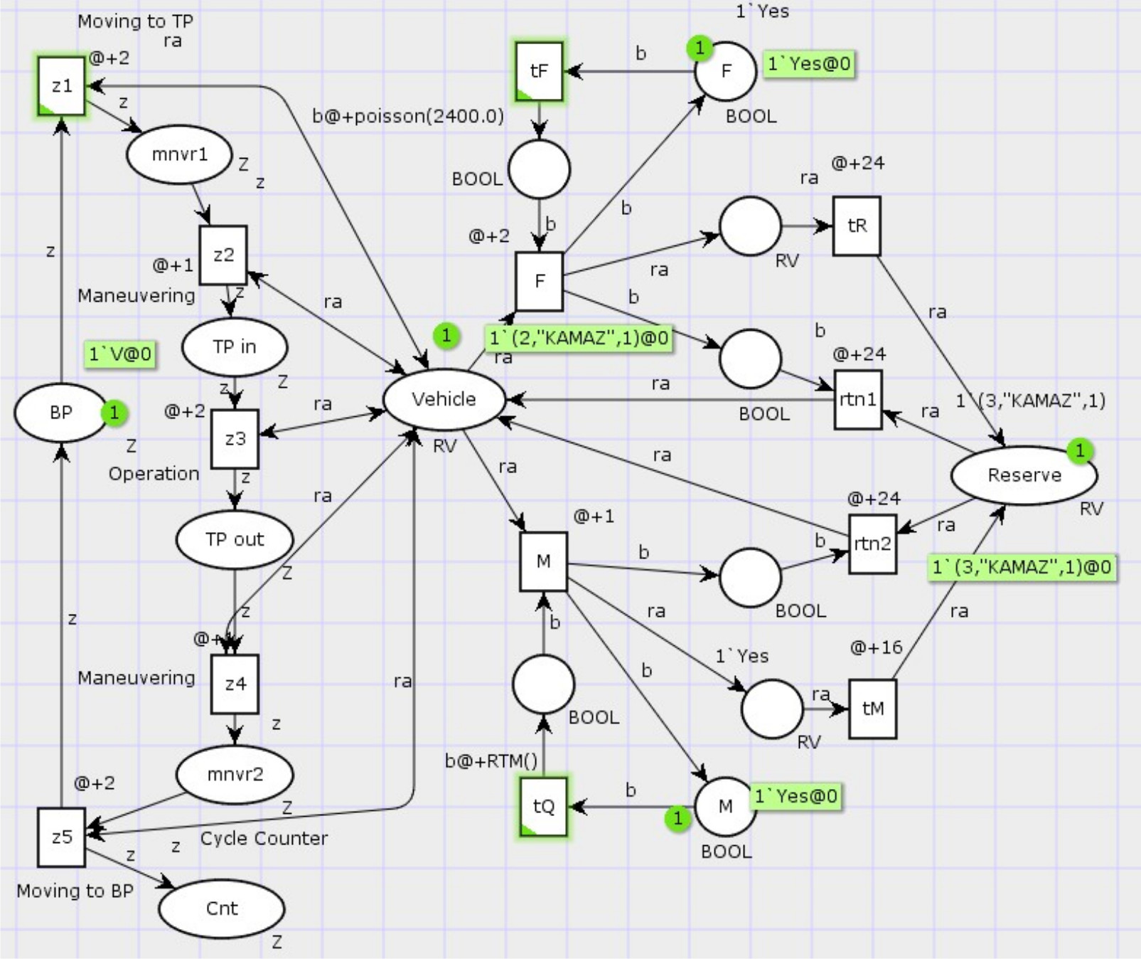 В раскрашенных сетях Петри исследуемые объекты описываются цветными маркерами в виде мультимножеств. На рис. 4 представлена имитационная модель на временной сети Петри для анализа процессов технического обслуживания и ремонта роботизированного автомобиля при выполнении определенного набора Z производственных задач. Модель построена с использованием программного средства CPN Tools [14].