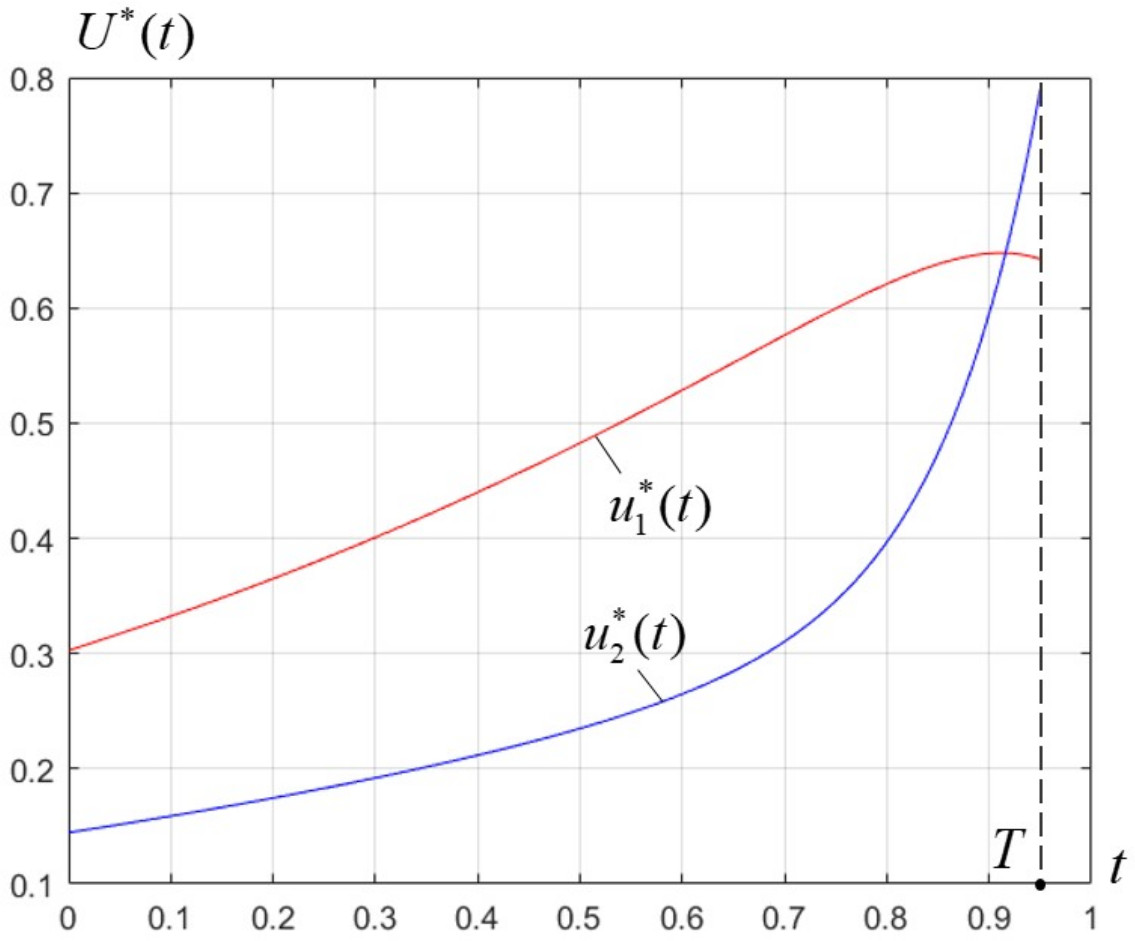 В рассматриваемой задаче оптимального управления требуется определить управляющие воздействия , , которые переводят объект управления (1)–(3) в требуемое конечное состояние (4) при минимальном значении критерия оптимальности (5).