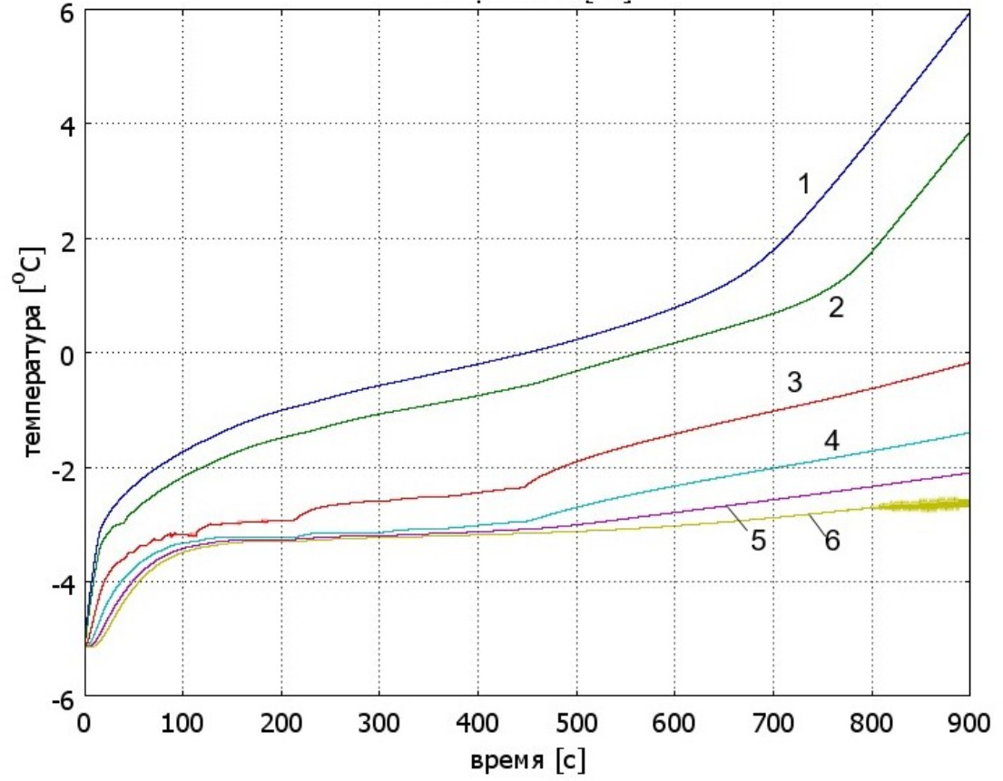 Согласно диаграммам, приведенным на рис. 5, температура водно-ледяной оболочки на расстоянии 6,5 мм от поверхности провода становится выше нуля через 650 с. Таким образом, время перемещения нагретого провода через комбинированную водно-ледяную оболочку снижается в несколько раз (положительные температуры соответствуют жидкой фазе). Мощность тепловыделения при заданных параметрах теплообмена с окружающей средой можно снизить еще больше.