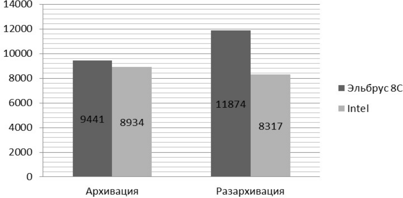 В данном тесте процессор Эльбрус 8С оказывается быстрее процессора Intel. Это можно объяснить большим количеством ядер и возможностью оптимизации под особенности архитектуры VLIW. В задаче архивации процессор Эльбрус оказался быстрее на 10 %, в задаче разархивирования – на 30 %. Из этого можно сделать вывод, что работа с алгоритмами сжатия рабочая станция Эльбрус работает достаточно эффективно, несмотря на малую частоту.