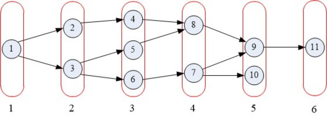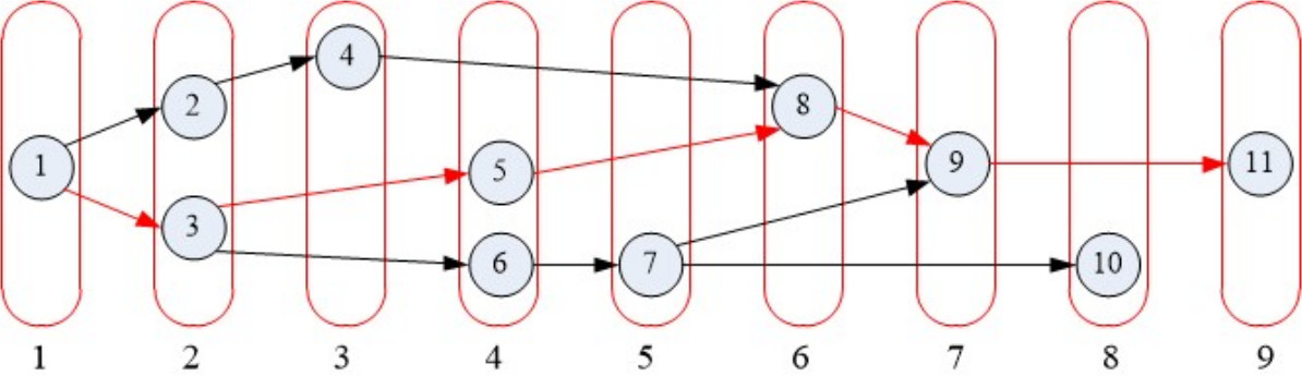 первое – увеличивая ширину на ярусно-параллельной форме (далее – ЯПФ) представления алгоритма и уменьшая ее высоту после расчета высоты канонической ЯПФ (поиск кратчайшего пути – путь 1–3–5–8–9–11 на рис. 3 и преобразование ЯПФ на рис. 4). Шириной ЯПФ является количество исполнителей (вычислительных ядер или функциональных модулей), которые могут быть задействованы. Высота ЯПФ – скорость выполнения алгоритма, т. е. количество ярусов можно представить количеством тактов. Построенная ЯПФ дает максимальную скорость и максимальную «жадность» (максимальное количество исполнителей) без изменения программной структуры самого алгоритма.